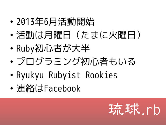 琉球.rb • 2013年6月活動開始 • 活動は月曜日(たまに火曜日) • Ruby初心者が大半 • プログラミング初心者もいる •