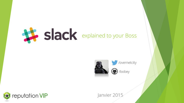for groups conversations (public or private) Direct Messages for one-to-one conversations Mentions to notify someone in a group conversation “@bob: pleaz, I need your opinion on…” Notifications are deeply customizable (less noise, enhanced productivity) Fun for all your employees Build from the ground to be developers friendly (API, code highlighting, …)