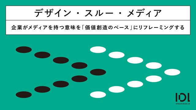 IDLは企業のメディアコミュニケーションを支援してきたインフォバーンのデザイン部門です。 多くの実践からメディアをデザインリサーチの手段として使う「デザイン・スルー・メディア」というメソッドを編み出しました。 メディアコミュニケーションのプロセスを重視し、インプットで得られる知見やスループットで交わるつながりをアセットとして価値化。事業開発ほかイノベーティブな活動に役立てます。事例とともに紹介します。