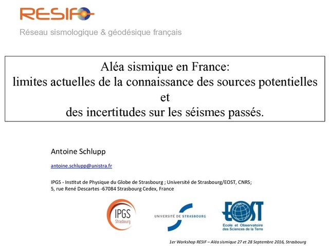 2016, Strasbourg Réseau sismologique & géodésique français Aléa sismique en France: limites actuelles de la connaissance des sources potentielles et des incertitudes sur les séismes passés. Antoine Schlupp [email protected] IPGS -‐ Ins8tut de Physique du Globe de Strasbourg ; Université de Strasbourg/EOST, CNRS; 5, rue René Descartes -‐67084 Strasbourg Cedex, France