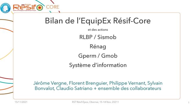 ans, les données sismologiques de Résif étaient distribuées par 5 institutions différentes : • CEA : réseaux sismique RD pour l’alerte nationale • ISTerre (LGIT) : RAP National Data Centre + déploiements temporaires • IPGP : GEOSCOPE et observatoires volcanologiques • Géoazur et EOST : stations BB et CP en métropole Objectif Résif-CORE : fédérer l’observation sismologique française et fournir un point d’accès unifié aux données sismologiques 15/11/2021 RST Résif-Epos, Obernai, 15-18 Nov. 20211 14