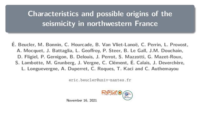 ethoux, ´ E. Beucler, S. Bruno, M. Calvet, S. Chevrot, A. Deboissy, B. Delouis, M. Denieul, A. Deschamps, C. Doubre, J. Fr´ echet, S. Godey, O. Golle, M. Grunberg, J. Guilbert, M. Haugmard, L. Jenatton, S. Lambotte, D. Leobal, C. Maron, V. Mendel, S. Merrer, M. Macquet, A. Mignan, A. Mocquet, M. Nicolas, J. Perrot, B. Potin, O. Sanchez, J.-P. Santoire, O. S` ebe, M. Sylvander, F. Thouvenot, J. Van Der Woerd & K. Van Der Woerd (2015). “SI-Hex: a new catalogue of instrumental seismicity for metropolitan France”. Bull. Soc. G´ eol. France 186(1), 3–19, doi:10.2113/gssgfbull.186.1.3. Gaudot, I., ´ E. Beucler, A. Mocquet, M. Drilleau, M. Haugmard, M. Bonnin, G. Aertgeerts & D. Leparoux (2021). “3-D crustal VS model of western France and the surrounding regions using Monte Carlo inversion of seismic noise cross-correlation dispersion diagrams”. Geophys. J. Int. 224(3), 2173–2188, doi:10.1093/gji/ggaa552. Jomard, H., O. Scotti, S. Auclair, P. Dominique, K. Manchuel & D. Sicilia (2021). “The SISFRANCE database of historical seismicity. State of the art and perspectives”. C. R. Geoscience, subm. Mazzotti, S., C. Aubagnac, L. Bollinger, K. Oscanoa, B. Delouis, D. Paco, C. Doubre, M. Godano, H. Jomard, C. Larroque, A. Laurendeau, F. Masson, M. Sylvander & A. Trilla (2021). “FMHex20: An earthquake focal mechanism database for seismotectonic analyses in metropolitan France and bordering regions”. BSGF - Earth Sci. Bull. 192, 10, doi:10.1051/bsgf/2020049. Beucler et al. NW France seismicity November 16, 2021 10