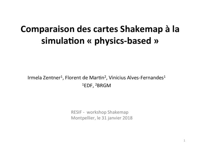 du mouvement sismique issue des Shakemap avec des résultats de simula1ons numériques. • Shakemap: éléments de valida1on supplémentaires. – Construit à par1r des intensités sismiques (témoignages), GMPE, enregistrements • Simula1ons numériques de propaga1on d’ondes (« physics-based ») – Simula1on de la faille au site avec le code EFISPEC3D par BRGM: distribu1on spa1ale du mouvement sismique dans le bassin de Grenoble. – Etudes d’effet de site 2D et 3D menées par EDF avec le code_aster avec capacités hpc (en développement): excita1on onde plane – Conversion des résultats des simula1ons (PGV, PGA) en intensité? RESIF workshop Shake Map 2