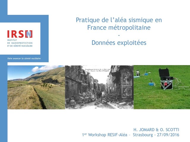 Yenne 7/12 152 évidences ponctuelles 96 rejetées; 52 possibles; 4 certaines 92 non analysées NEOPAL NEOtectonique – PALeosismologie Projet national (2000) financé par le ministère de l’environnement. Environ 10 experts (Université, CNRS, CEA, EDF, IRSN) Base d’indices et non de failles Seules 7 failles actives potentielles ont été analysées. 5 qualifiées d’actives (Durance, Nîmes, Trévaresse, Digne, Sud-Têt Cerdagne faults), et 2 possiblement Seule action partagée, abandonnée en 2009 1er workshop RESIF-Aléa – Strasbourg – 27 & 28/09/2016