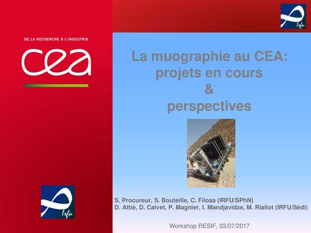 demandes d’industriels → Financement de 2 télescopes de 1m² à l’horizon 2018 → Upgrade du portique M-Cube de 1 à 2 m² d’ici 2018 → Prototype de TPC cylindrique (forage) d’ici 2019 Objectifs: PoC pour industriels (au moins 5 à ce jour) Activités de R&D en parallèle → R&D détecteurs pour améliorer la résolution spatiale (0,35 -> 0,1 mm) → R&D gaz sur fonctionnement en mode (semi-)scellé (étanchéité + dégazage) S. Procureur RESIF| 03/07/2017 Design: M. Riallot