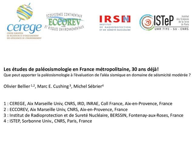 Que peut apporter la paléosismologie à l’évaluation de l’aléa sismique en domaine de séismicité modérée ? Olivier Bellier1,2, Marc E. Cushing 3, Michel Sébrier4 1 : CEREGE, Aix Marseille Univ, CNRS, IRD, INRAE, Coll France, Aix-en-Provence, France 2 : ECCOREV, Aix Marseille Univ, CNRS, Aix-en-Provence, France 3 : Institut de Radioprotection et de Sureté Nucléaire, BERSSIN, Fontenay-aux-Roses, France 4 : ISTEP, Sorbonne Univ., CNRS, Paris, France Les études de paléosismologie en France métropolitaine, 30 ans déjà! Que peut apporter la paléosismologie à l’évaluation de l’aléa sismique en domaine de séismicité modérée ? Olivier Bellier1,2, Marc E. Cushing 3, Michel Sébrier4 1 : CEREGE, Aix Marseille Univ, CNRS, IRD, INRAE, Coll France, Aix-en-Provence, France 2 : ECCOREV, Aix Marseille Univ, CNRS, Aix-en-Provence, France 3 : Institut de Radioprotection et de Sureté Nucléaire, BERSSIN, Fontenay-aux-Roses, France 4 : ISTEP, Sorbonne Univ., CNRS, Paris, France