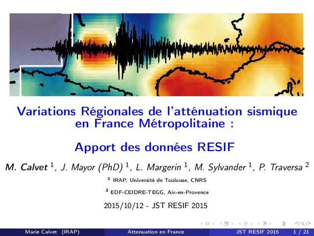 des données RESIF M. Calvet 1, J. Mayor (PhD) 1, L. Margerin 1, M. Sylvander 1, P. Traversa 2 1 IRAP, Université de Toulouse, CNRS 2 EDF-CEIDRE-TEGG, Aix-en-Provence 2015/10/12 - JST RESIF 2015 Marie Calvet (IRAP) Attenuation en France JST RESIF 2015 1 / 21