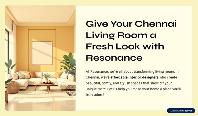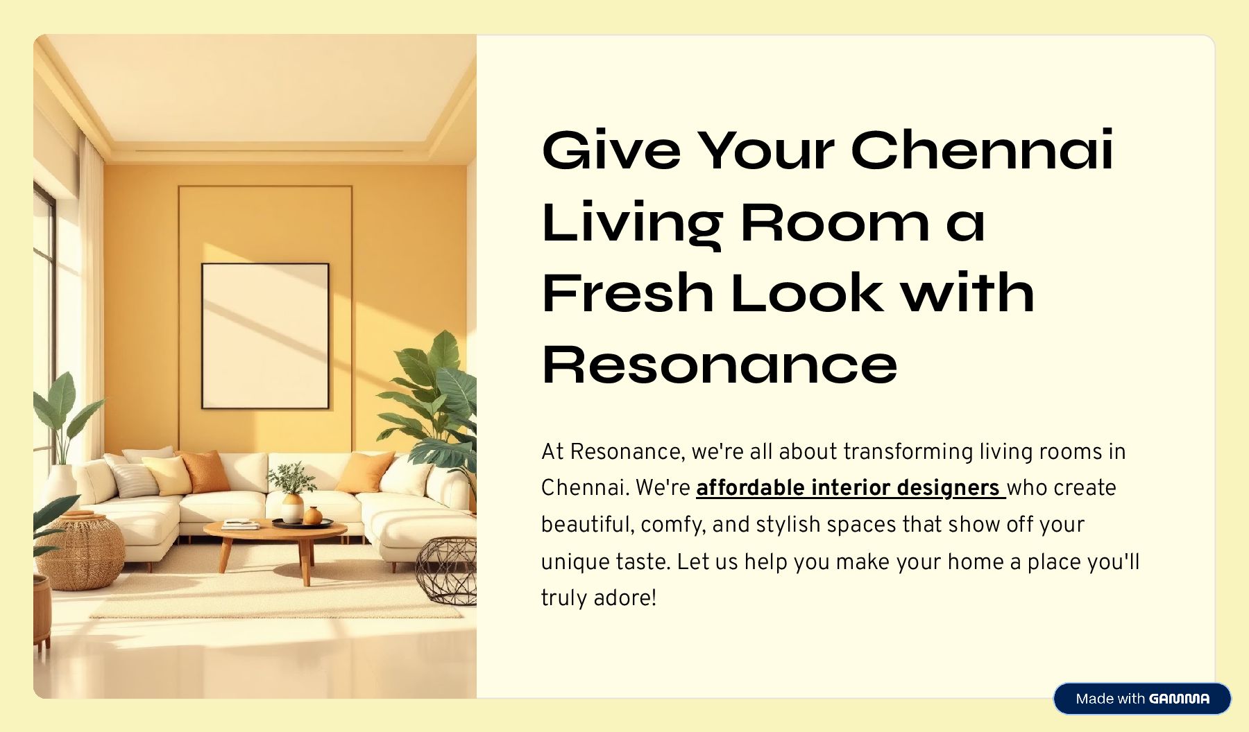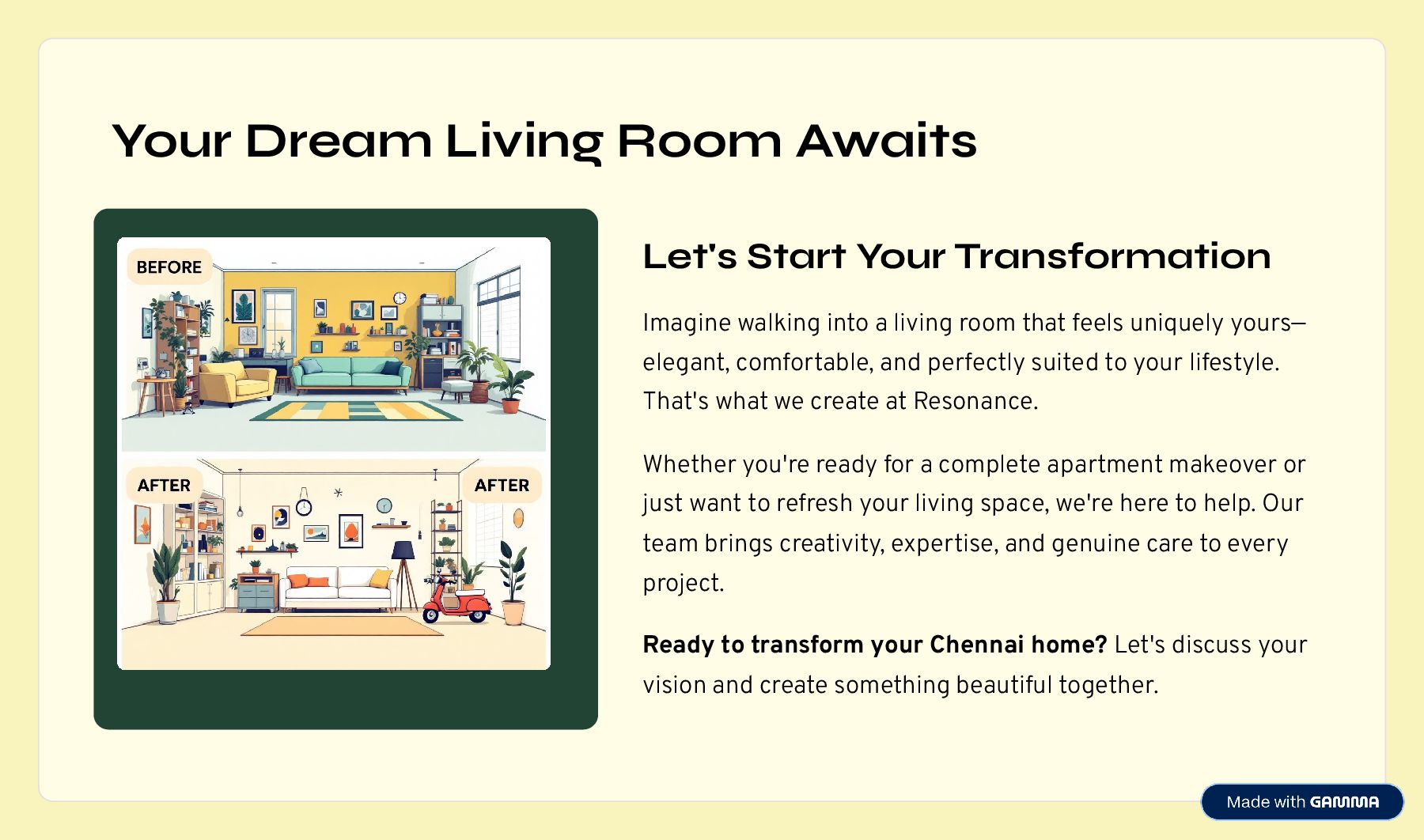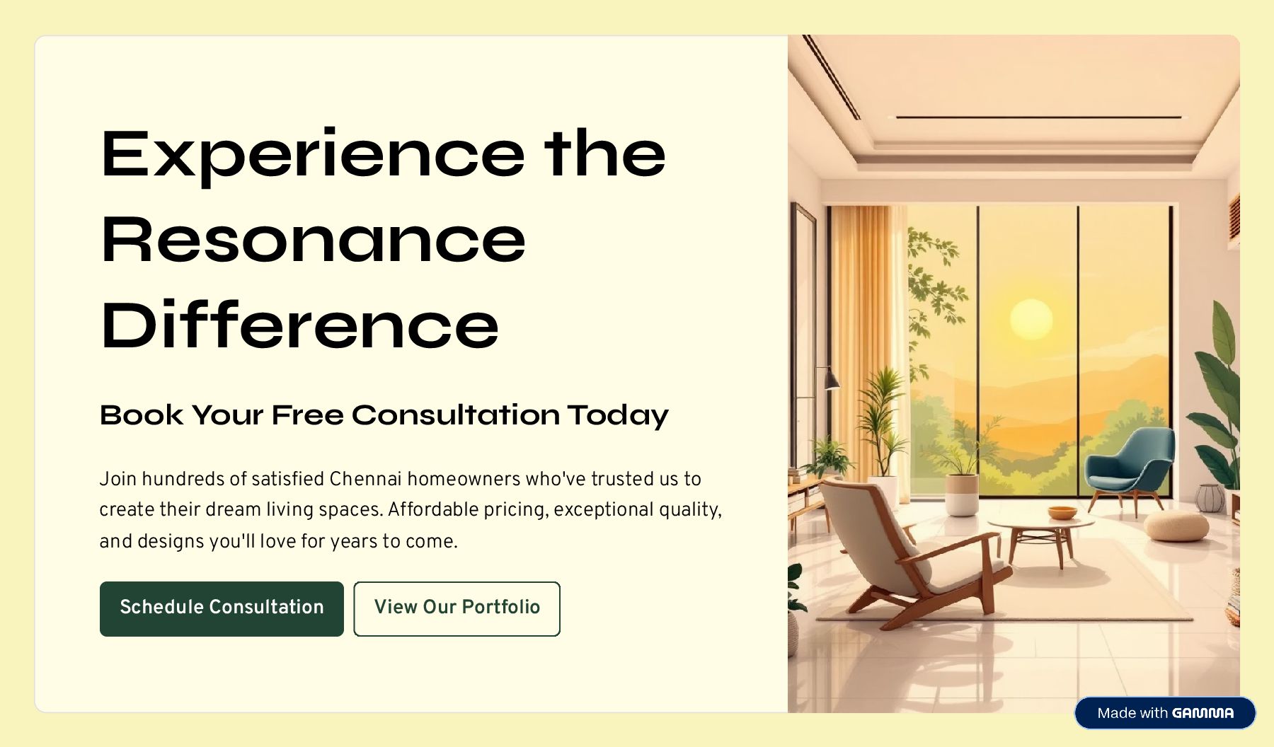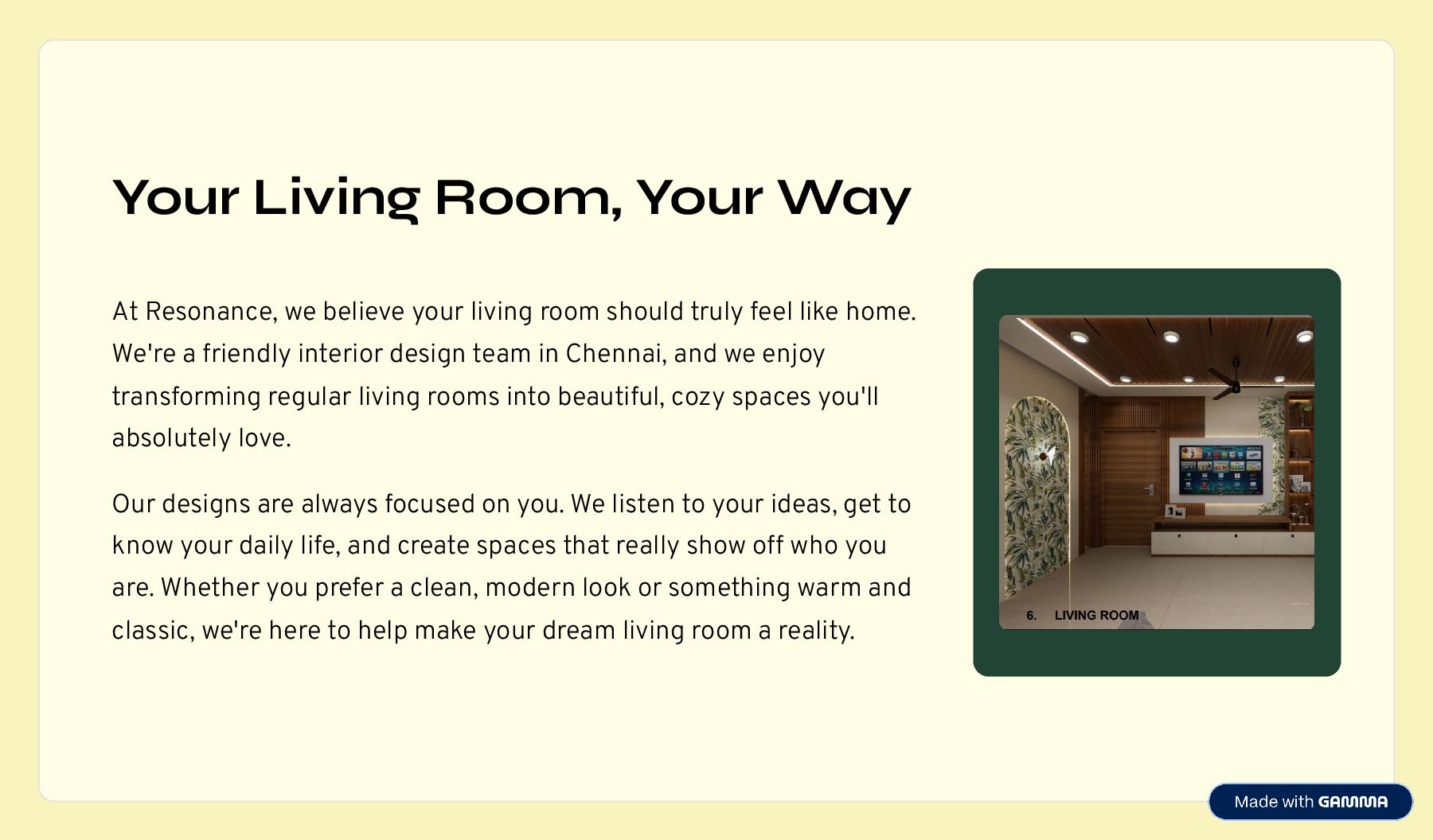 walking into a living room that feels uniquely yours4 elegant, comfortable, and perfectly suited to your lifestyle. That's what we create at Resonance. Whether you're ready for a complete apartment makeover or just want to refresh your living space, we're here to help. Our team brings creativity, expertise, and genuine care to every project. Ready to transform your Chennai home? Let's discuss your vision and create something beautiful together.