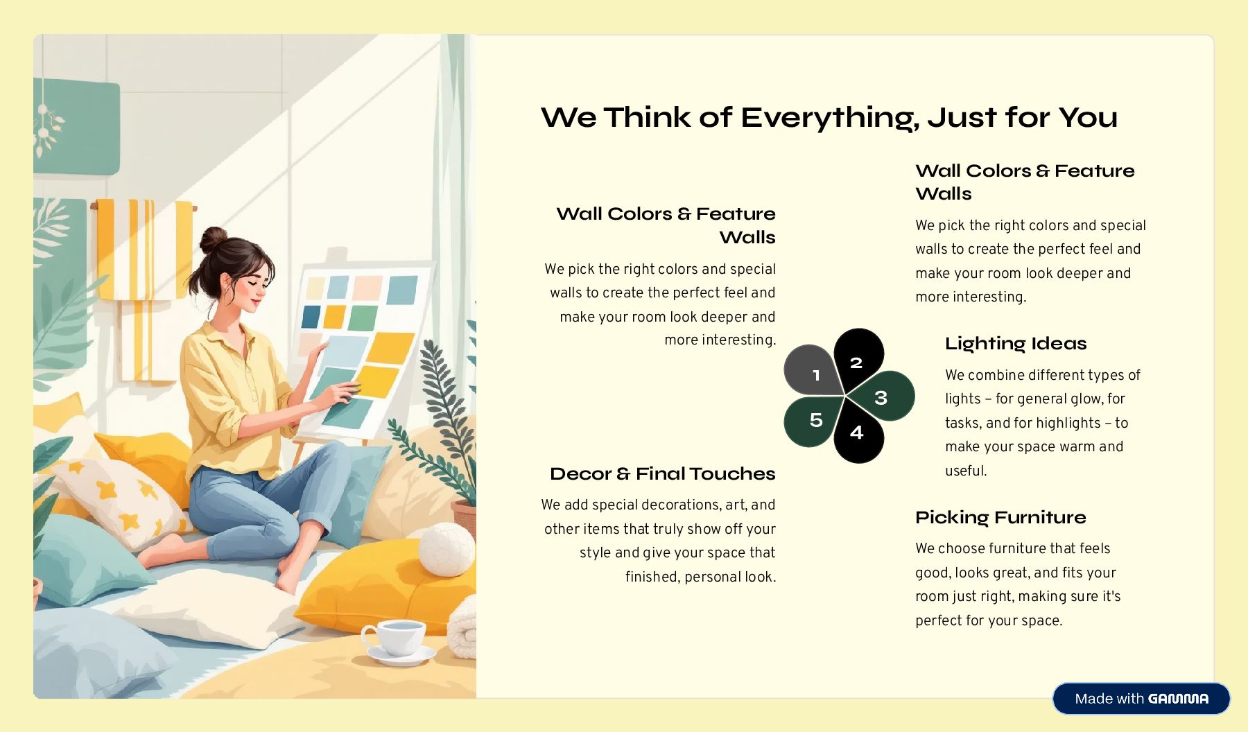 4 5 Wall Colors & Feature Walls We pick the right colors and special walls to create the perfect feel and make your room look deeper and more interesting. Wall Colors & Feature Walls We pick the right colors and special walls to create the perfect feel and make your room look deeper and more interesting. Lighting Ideas We combine different types of lights 3 for general glow, for tasks, and for highlights 3 to make your space warm and useful. Picking Furniture We choose furniture that feels good, looks great, and fits your room just right, making sure it's perfect for your space. Decor & Final Touches We add special decorations, art, and other items that truly show off your style and give your space that finished, personal look.