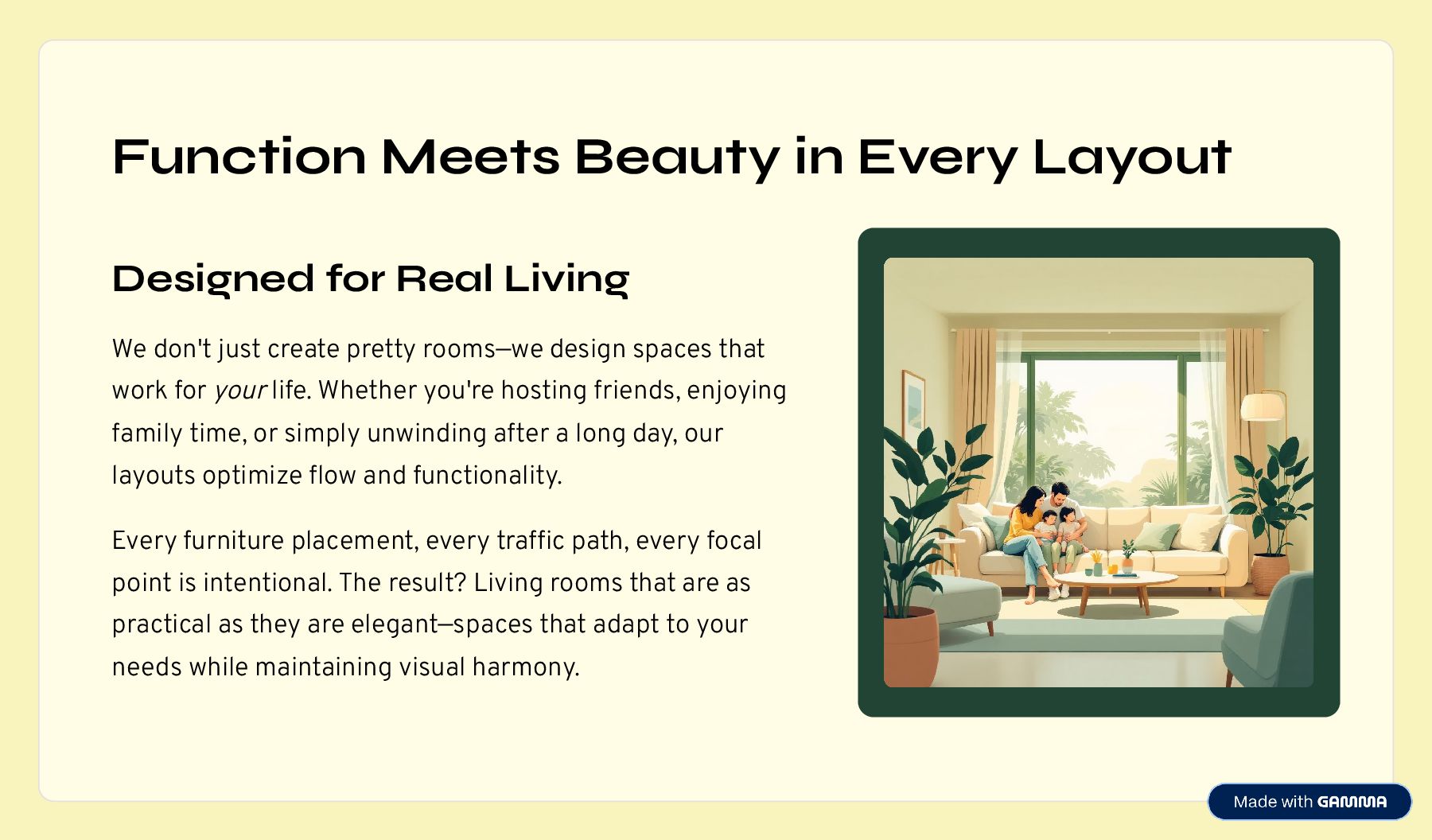 We don't just create pretty rooms4we design spaces that work for your life. Whether you're hosting friends, enjoying family time, or simply unwinding after a long day, our layouts optimize flow and functionality. Every furniture placement, every traffic path, every focal point is intentional. The result? Living rooms that are as practical as they are elegant4spaces that adapt to your needs while maintaining visual harmony.