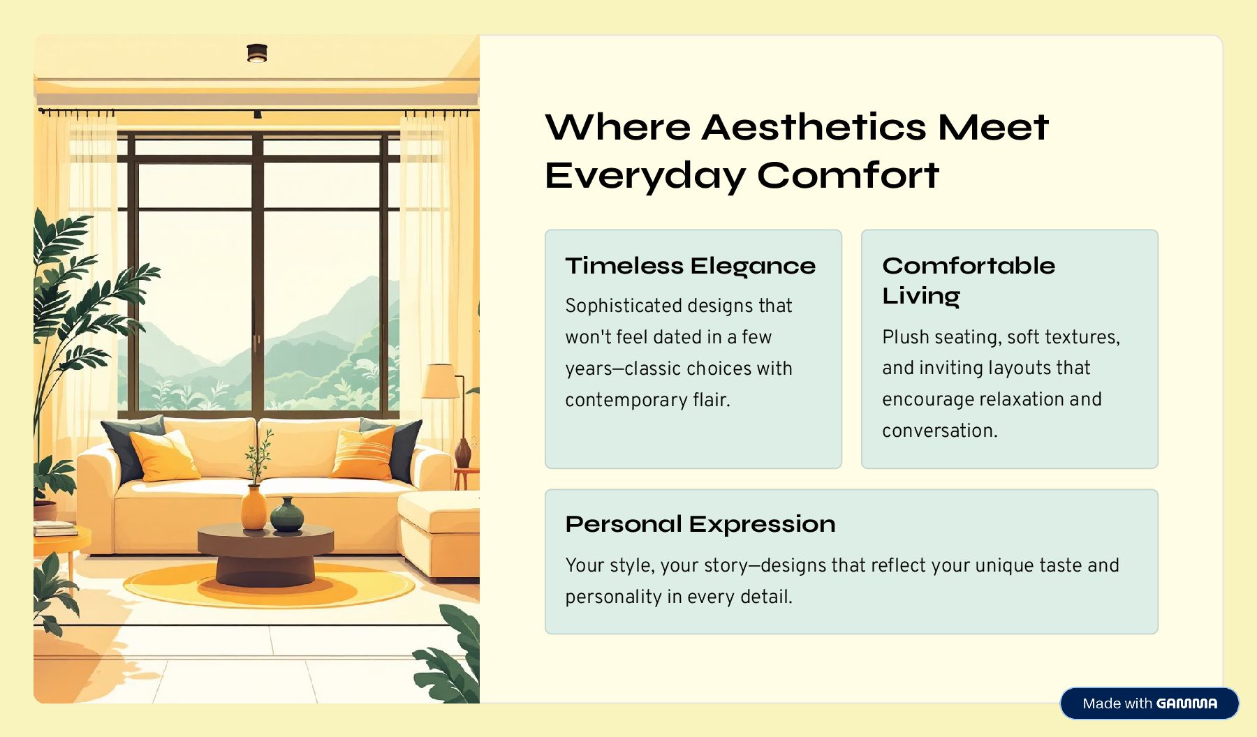 won't feel dated in a few years4classic choices with contemporary flair. Comfortable Living Plush seating, soft textures, and inviting layouts that encourage relaxation and conversation. Personal Expression Your style, your story4designs that reflect your unique taste and personality in every detail.