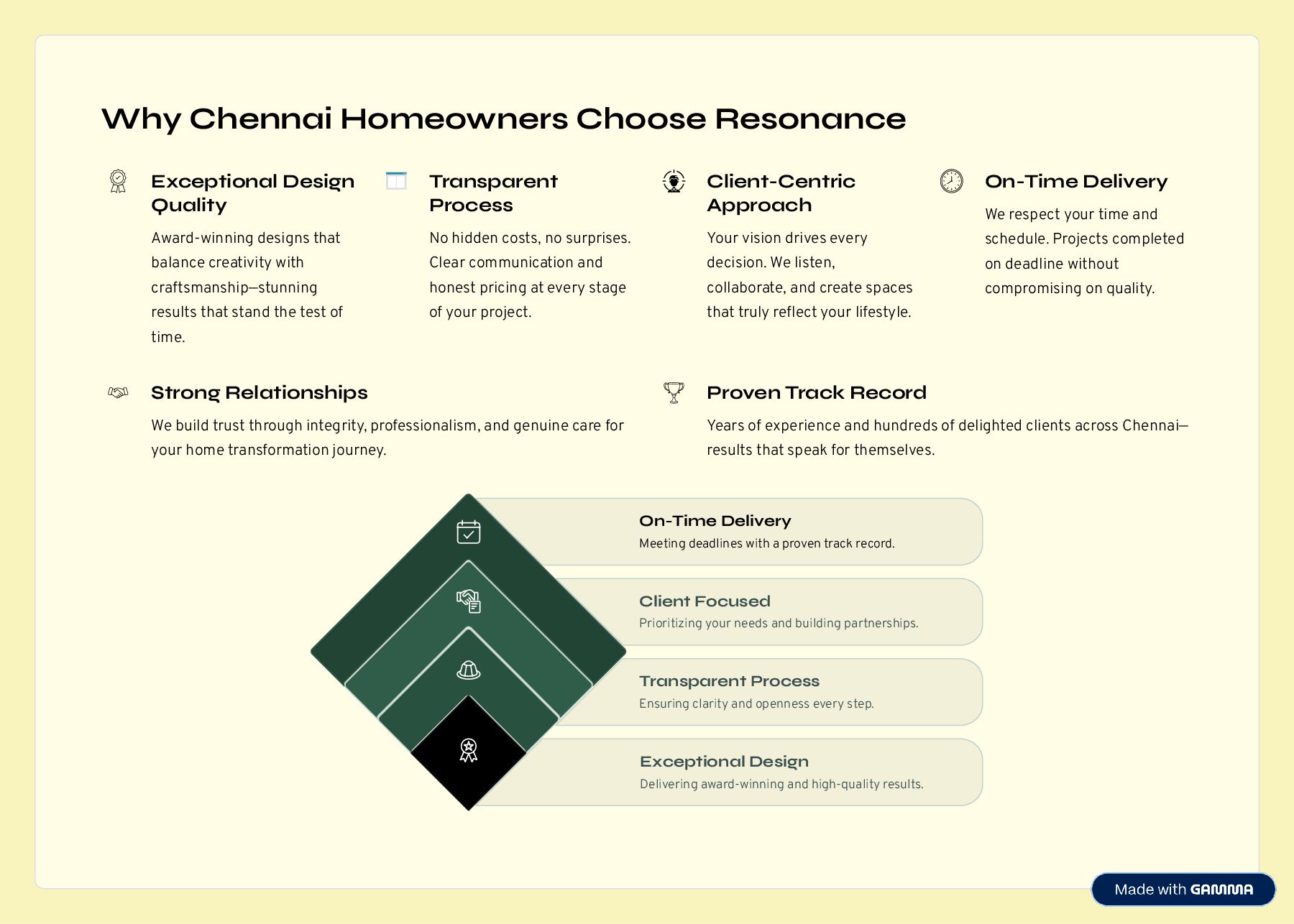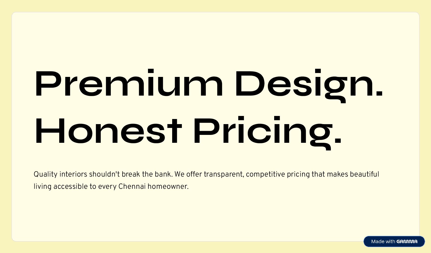 that balance creativity with craftsmanship4stunning results that stand the test of time. Transparent Process No hidden costs, no surprises. Clear communication and honest pricing at every stage of your project. Client-Centric Approach Your vision drives every decision. We listen, collaborate, and create spaces that truly reflect your lifestyle. On-Time Delivery We respect your time and schedule. Projects completed on deadline without compromising on quality. Strong Relationships We build trust through integrity, professionalism, and genuine care for your home transformation journey. Proven Track Record Years of experience and hundreds of delighted clients across Chennai4 results that speak for themselves. On-Time Delivery Meeting deadlines with a proven track record. Client Focused Prioritizing your needs and building partnerships. Transparent Process Ensuring clarity and openness every step. Exceptional Design Delivering award-winning and high-quality results.