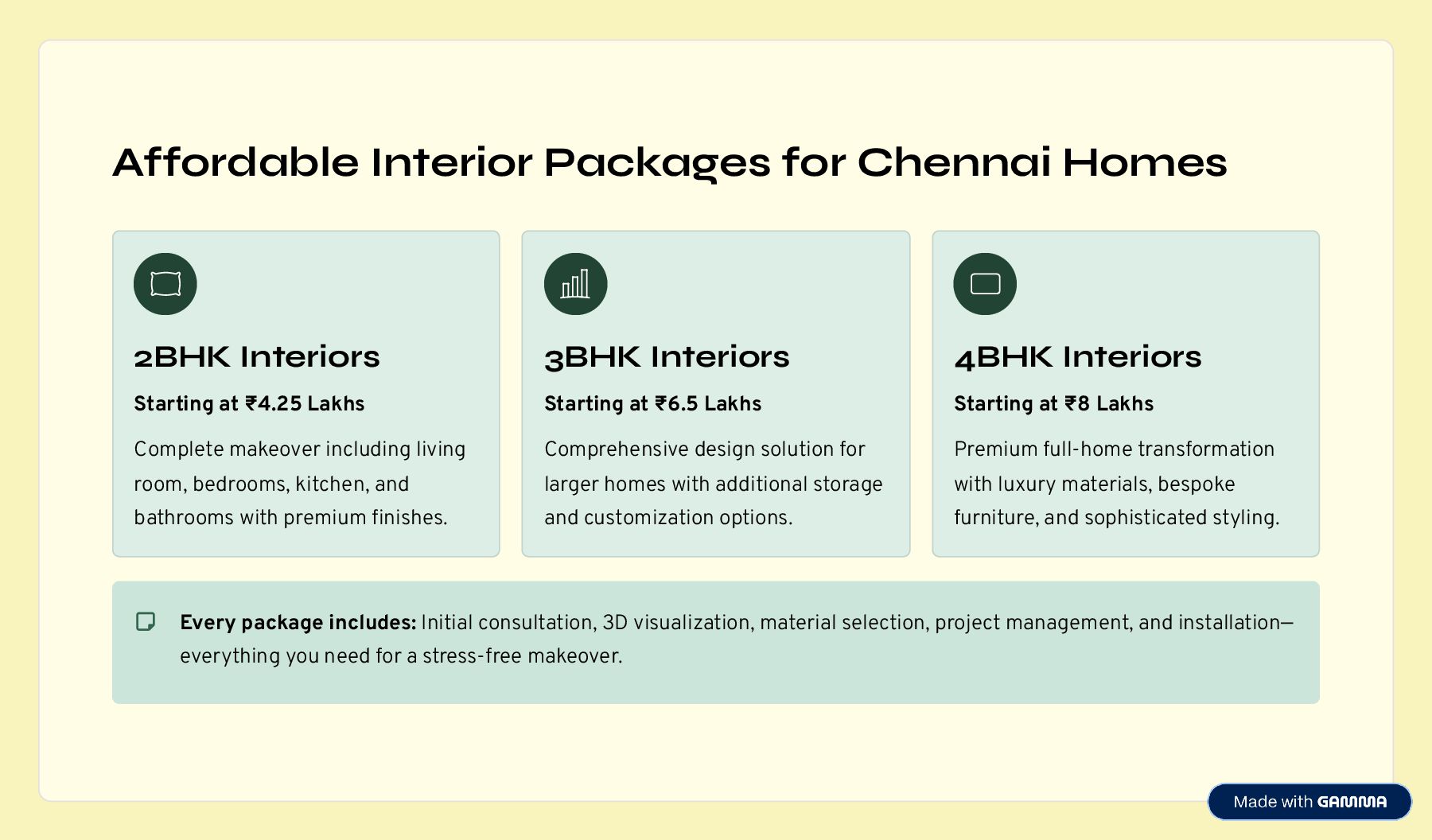 ¹4.25 Lakhs Complete makeover including living room, bedrooms, kitchen, and bathrooms with premium finishes. 3BHK Interiors Starting at ¹6.5 Lakhs Comprehensive design solution for larger homes with additional storage and customization options. 4BHK Interiors Starting at ¹8 Lakhs Premium full-home transformation with luxury materials, bespoke furniture, and sophisticated styling. Every package includes: Initial consultation, 3D visualization, material selection, project management, and installation4 everything you need for a stress-free makeover.