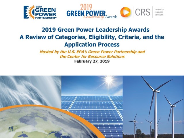 The 2019 Green Power Leadership Awards application period is open until Friday, March 15. EPA co-sponsors the Awards in conjunction with the Center for Resource Solutions (CRS). The awards recognize leading organizations that have helped further the green power market through their green power procurement, innovation, overall green power strategy, and impact.