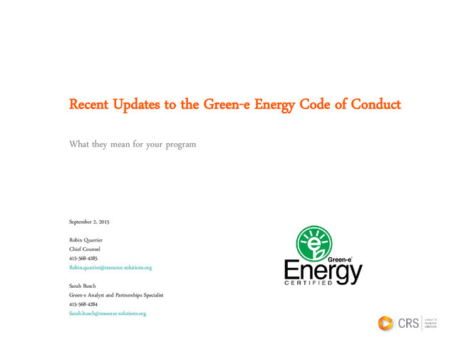 Green-e Energy recently updated the Green-e Energy Code of Conduct (formerly the Green-e Energy Code of Conduct and Customer Disclosure Requirements) to include new timelines for communications and deadlines, updated requirements for product content labels, and more. This webinar will review recent changes and answer questions from participants.