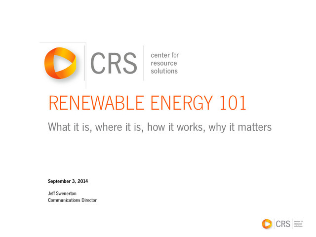 Wednesday, September 3, 2014 at 11:00 am PT. This essential introduction to renewable energy covers the basics of how clean energy operates in the U.S. electricity grid. The hour-long webinar reviews renewable energy terms and definitions, types and technology, geographic distribution of resources like wind and solar, the basics of transmission and project financing, renewable energy certificates (RECs) and utility green power programs, and REC tracking systems. We will also cover the state of the renewable energy marketplace, including a brief overview of politics, players, and policies.
