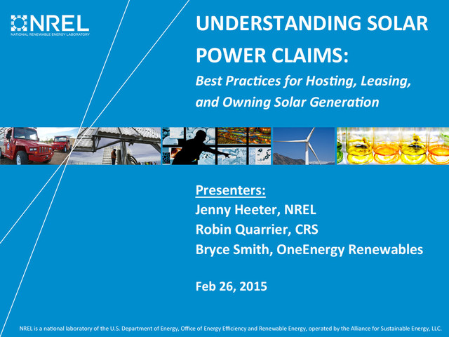 The new solar boom has brought with it increasing complexity around renewable energy claims. Because ownership of the environmental benefits is not always made clear, the potential for double claiming on the part of utilities, providers, and hosts has never been greater. Join Robin Quarrier, CRS Chief Counsel; Jenny Heeter, Energy Analyst at the National Renewable Energy Laboratory; and Bryce Smith, Chief Executive Officer of OneEnergy Renewables for a look at the current state of the market and best practices for participants in the solar marketplace. Presented Thursday, February 26, 2015 at 11:00 am PT.