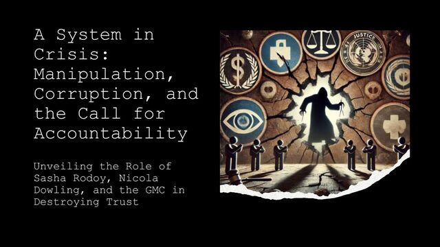 with Integrity: The GMC, instead of dismissing fraudulent complaints, entertained cases against doctors that were built on false evidence. Its lack of thorough investigation allowed these cases to persist, dragging medical professionals into long, costly legal battles. •Empowering Fraudulent Actors: By allowing individuals like Rodoy to manipulate juries without consequence, the GMC showed its susceptibility to external influence. Its failure to take action against blatant fraud damaged its credibility and led to the harassment of reputable professionals. •Collusion or Negligence?: The GMC’s actions have raised serious questions about whether its inaction was due to negligence or deliberate collusion with media figures like Dowling. This lack of accountability compromised the integrity of the medical system.