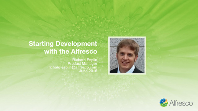 Community / Alfresco One → Developer Guide → Alfresco SDK 2.2.0 SDK Project (see the tutorial video in the README.md) github.com/Alfresco/alfresco-sdk SDK Samples github.com/Alfresco/alfresco-sdk-samples Development