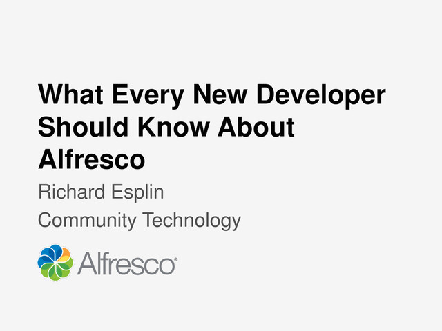 by OASIS Alfresco uses OpenCMIS, the de facto standard implementation of the spec • Available at http://chemistry.apache.org All you need is a service URL • http://localhost:8080/alfresco/cmisatom (4.x) For Java, Python, .NET, PHP, Objective-C, Android libraries see Apache Chemistry