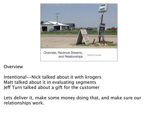 about it with krogers Matt talked about it in evaluating segments Jeff Turn talked about a gift for the customer Lets deliver it, make some money doing that, and make sure our relationships work.