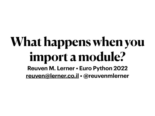What happens when you import a module? • A lot! • Python checks if the module has been cached • If so, it returns the module, and assigns the variable • If not, it goes through f inders in sys.meta_path • If none of them f inds the module, you get an exception • The f inder that works returns a module spec object • Python creates a new, empty module object • It uses the loader to exec the source code into the module’s __dict__, thus making globals into attributes So, what happens when you import?