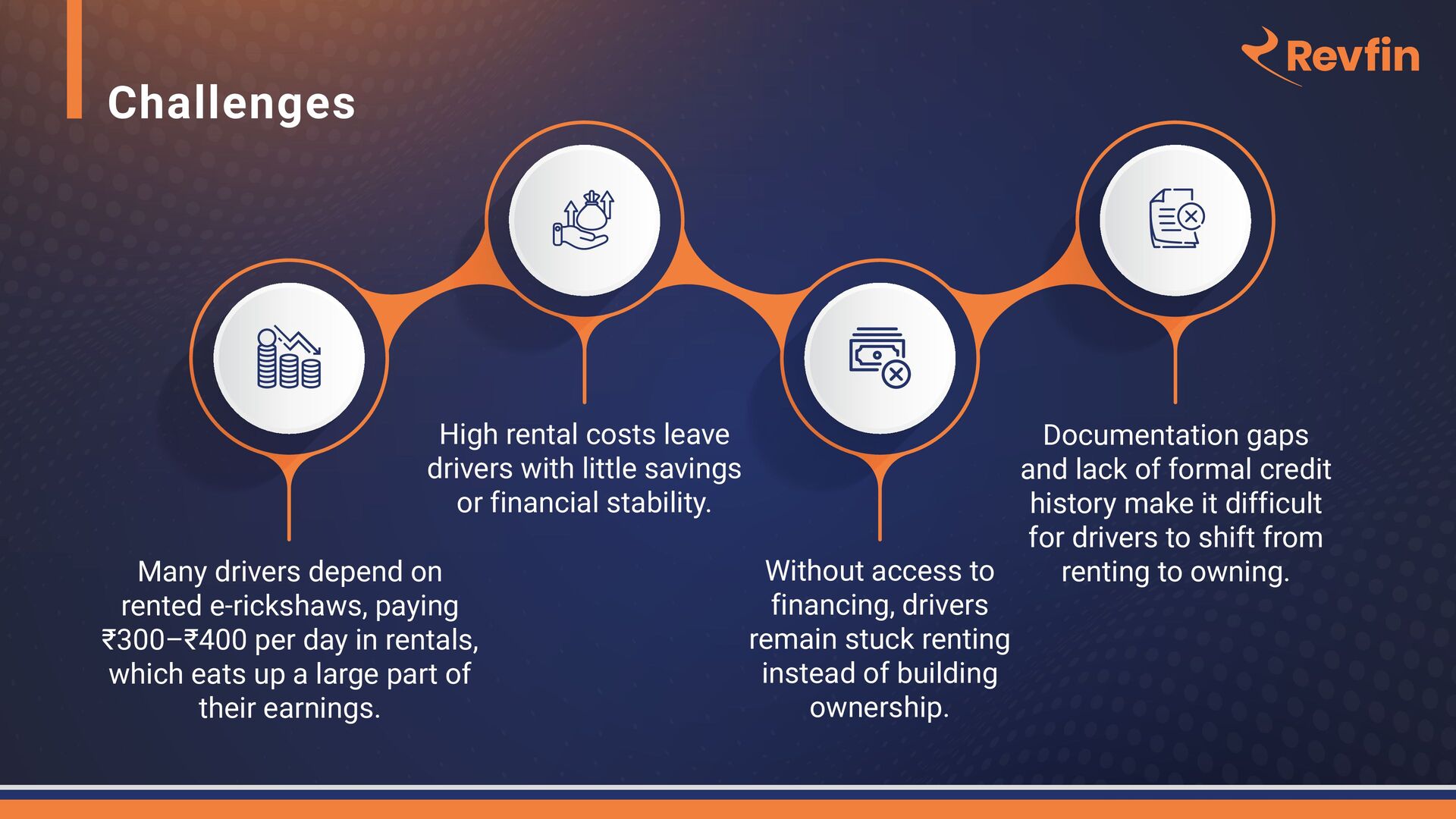 day in rentals, which eats up a large part of their earnings. High rental costs leave drivers with little savings or financial stability. Without access to financing, drivers remain stuck renting instead of building ownership. Documentation gaps and lack of formal credit history make it difficult for drivers to shift from renting to owning.