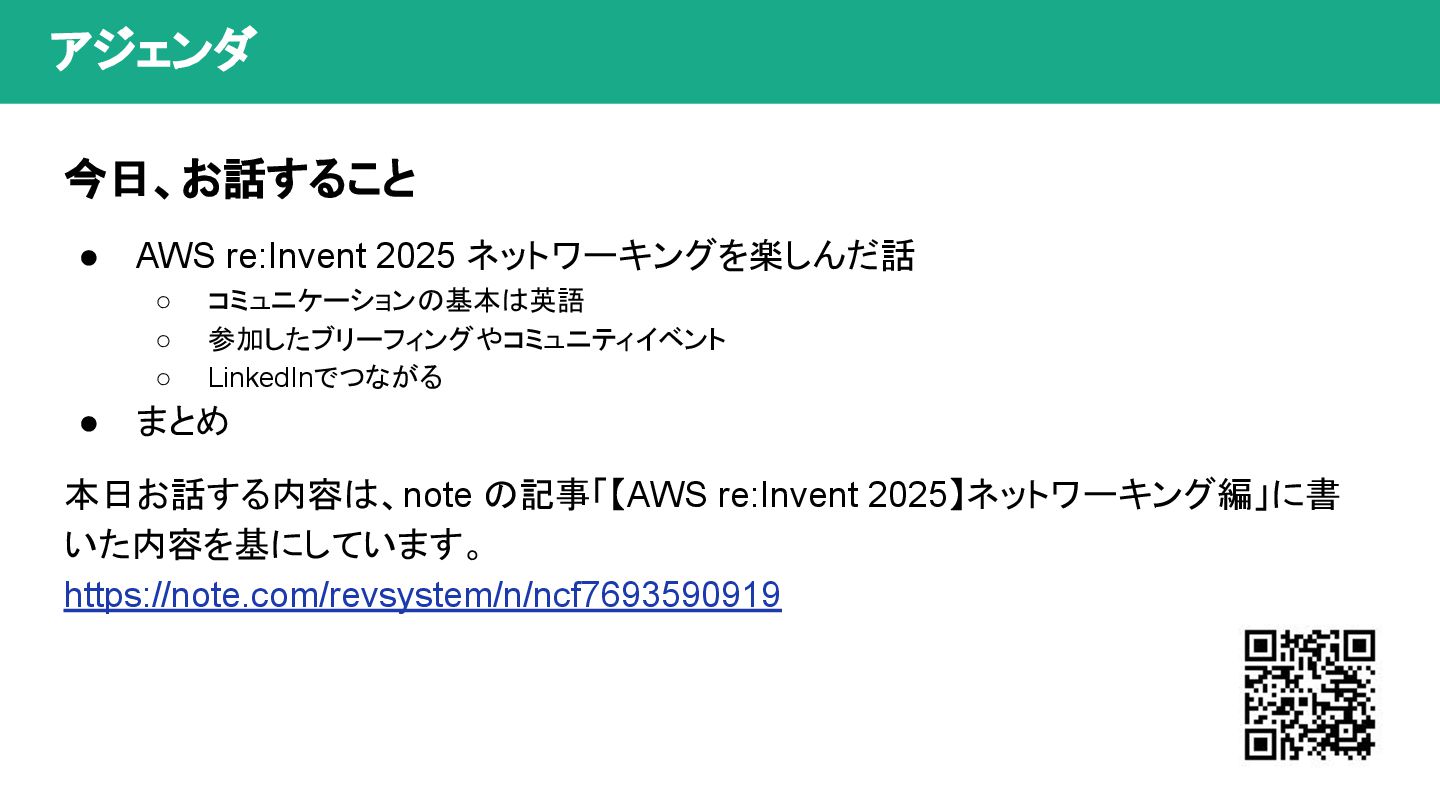 ◦ LinkedInでつながる • まとめ 本日お話する内容は、note の記事「【AWS re:Invent 2025】ネットワーキング編」に書 いた内容を基にしています。 https://note.com/revsystem/n/ncf7693590919 今日、お話すること