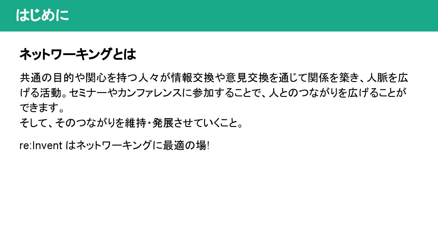 はじめに 共通の目的や関心を持つ人々が情報交換や意見交換を通じて関係を築き、人脈を広 げる活動。セミナーやカンファレンスに参加することで、人とのつながりを広げることが できます。 そして、そのつながりを維持・発展させていくこと。 re:Invent はネットワーキングに最適の場! ネットワーキングとは