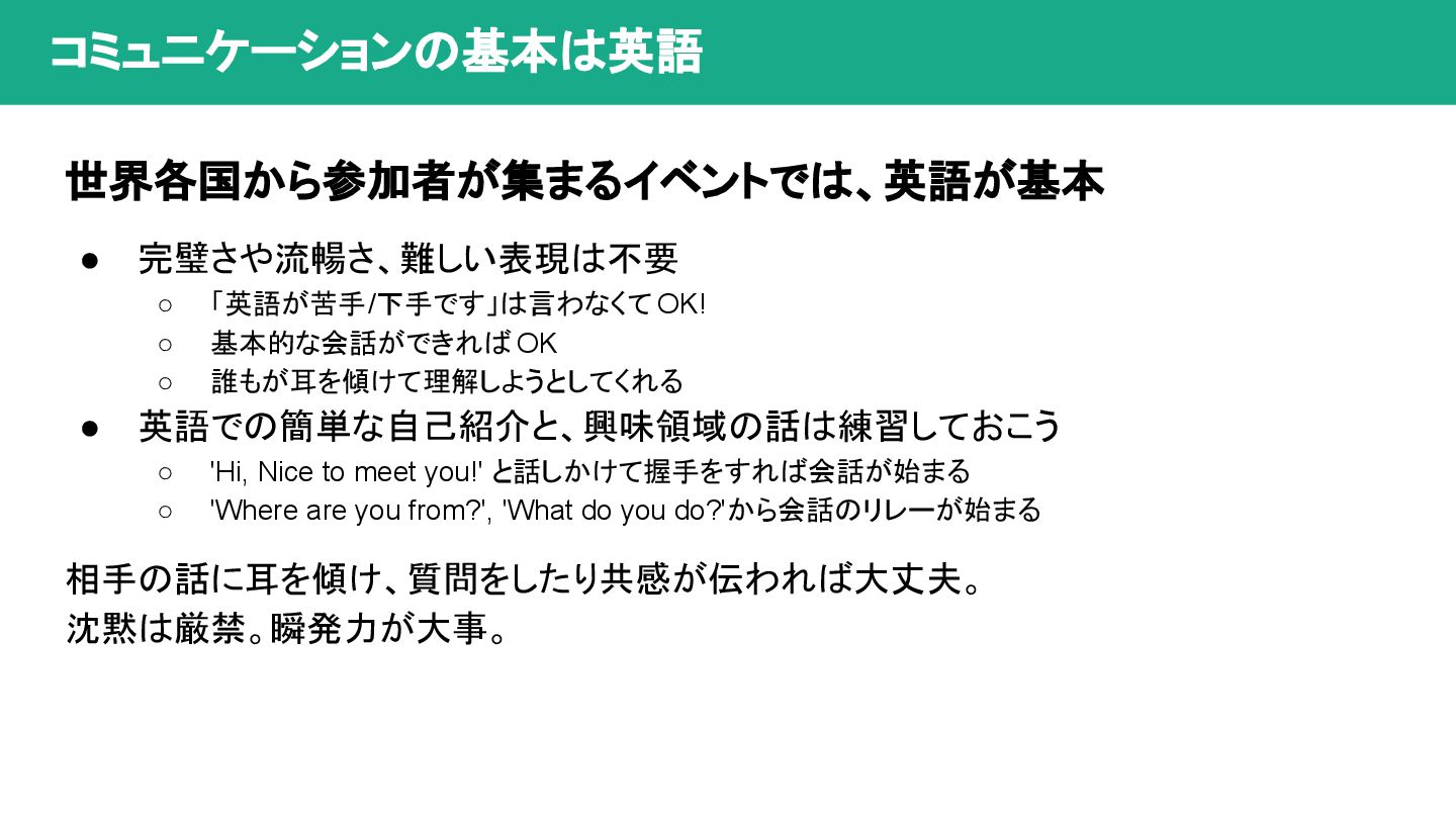 誰もが耳を傾けて理解しようとしてくれる • 英語での簡単な自己紹介と、興味領域の話は練習しておこう ◦ 'Hi, Nice to meet you!' と話しかけて握手をすれば会話が始まる ◦ 'Where are you from?', 'What do you do?'から会話のリレーが始まる 相手の話に耳を傾け、質問をしたり共感が伝われば大丈夫。 沈黙は厳禁。瞬発力が大事。 世界各国から参加者が集まるイベントでは、英語が基本