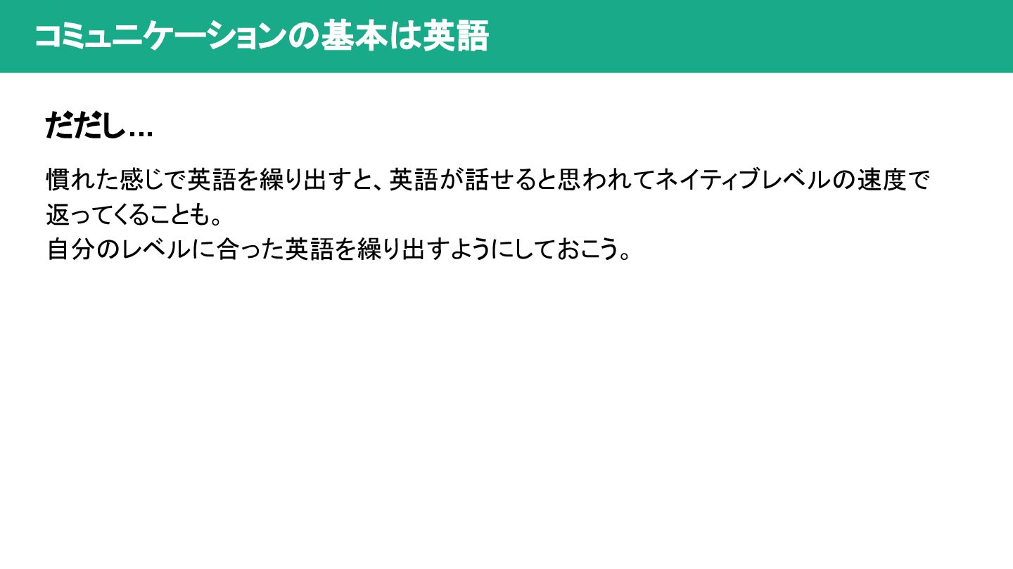 コミュニケーションの基本は英語 慣れた感じで英語を繰り出すと、英語が話せると思われてネイティブレベルの速度で 返ってくることも。 自分のレベルに合った英語を繰り出すようにしておこう。 だだし...