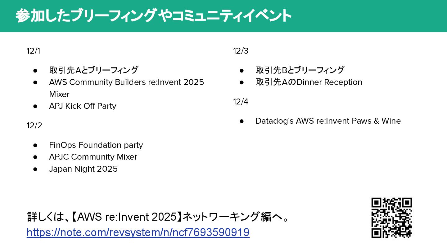 • APJ Kick Off Party 12/2 • FinOps Foundation party • APJC Community Mixer • Japan Night 2025 12/3 • 取引先Bとブリーフィング • 取引先AのDinner Reception 12/4 • Datadog's AWS re:Invent Paws & Wine 参加したブリーフィングやコミュニティイベント 詳しくは、【AWS re:Invent 2025】ネットワーキング編へ。 https://note.com/revsystem/n/ncf7693590919