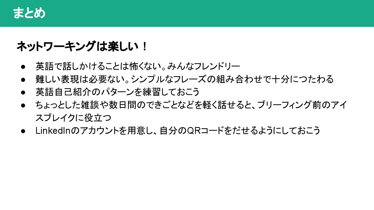 まとめ • 英語で話しかけることは怖くない。みんなフレンドリー • 難しい表現は必要ない。シンプルなフレーズの組み合わせで十分につたわる • 英語自己紹介のパターンを練習しておこう • ちょっとした雑談や数日間のできごとなどを軽く話せると、ブリーフィング前のアイ スブレイクに役立つ
