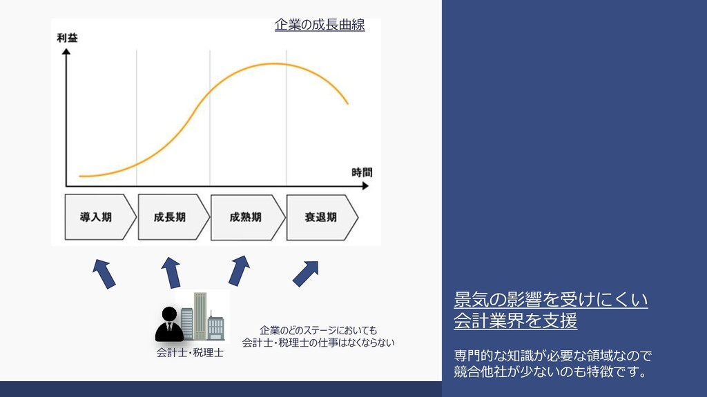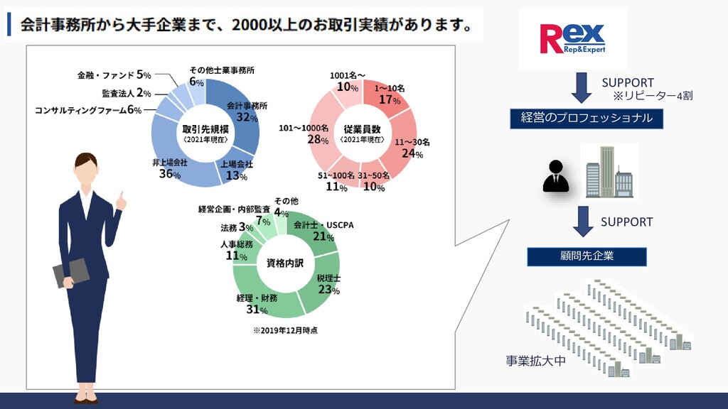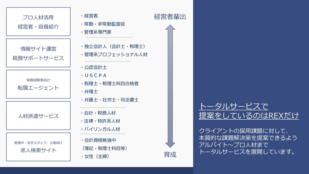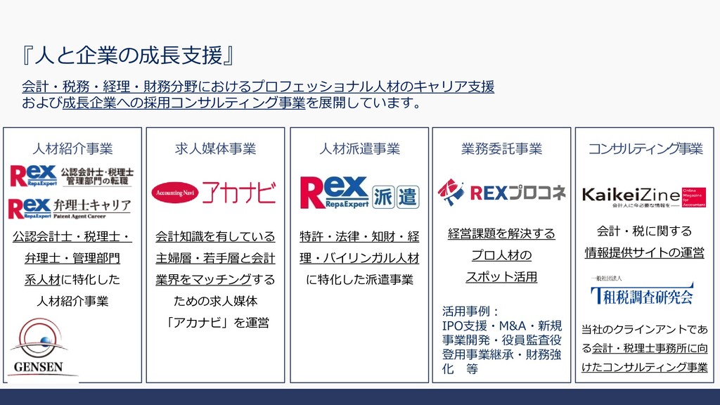 人材紹介事業 公認会計士・税理士・ 弁理士・管理部門 系人材に特化した 人材紹介事業 『人と企業の成長支援』 人材派遣事業 特許・法律・知財・経 理・バイリンガル人材 に特化した派遣事業 コンサルティング事業 会計・税に関する 情報提供サイトの運営 当社のクラインアントであ る会計・税理士事務所に向 けたコンサルティング事業 会計・税務・経理・財務分野におけるプロフェッショナル人材のキャリア支援 および成長企業への採用コンサルティング事業を展開しています。 活用事例: IPO支援・M&A・新規 事業開発・役員監査役 登用事業継承・財務強 化 等