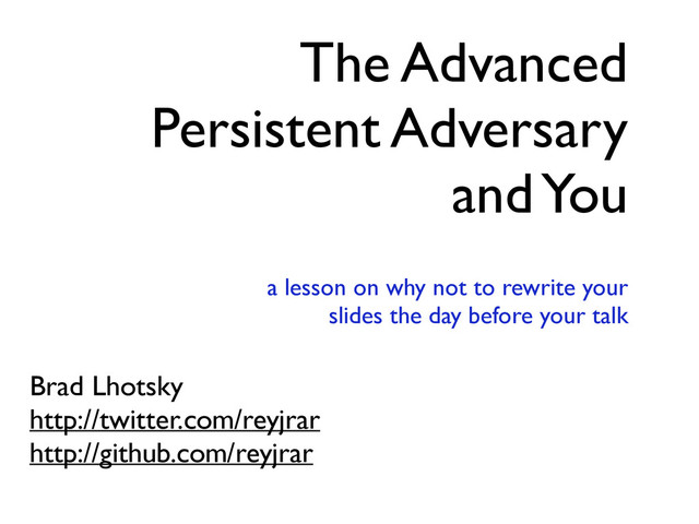 Introduction to APT for Perl Programmers presented at YAPC::NA in 2011. High level overview of why it matters to programmers, and how they can help protect their organizations. Yes, APT is a security buzzword, but it is very much a part of the world we software in!
