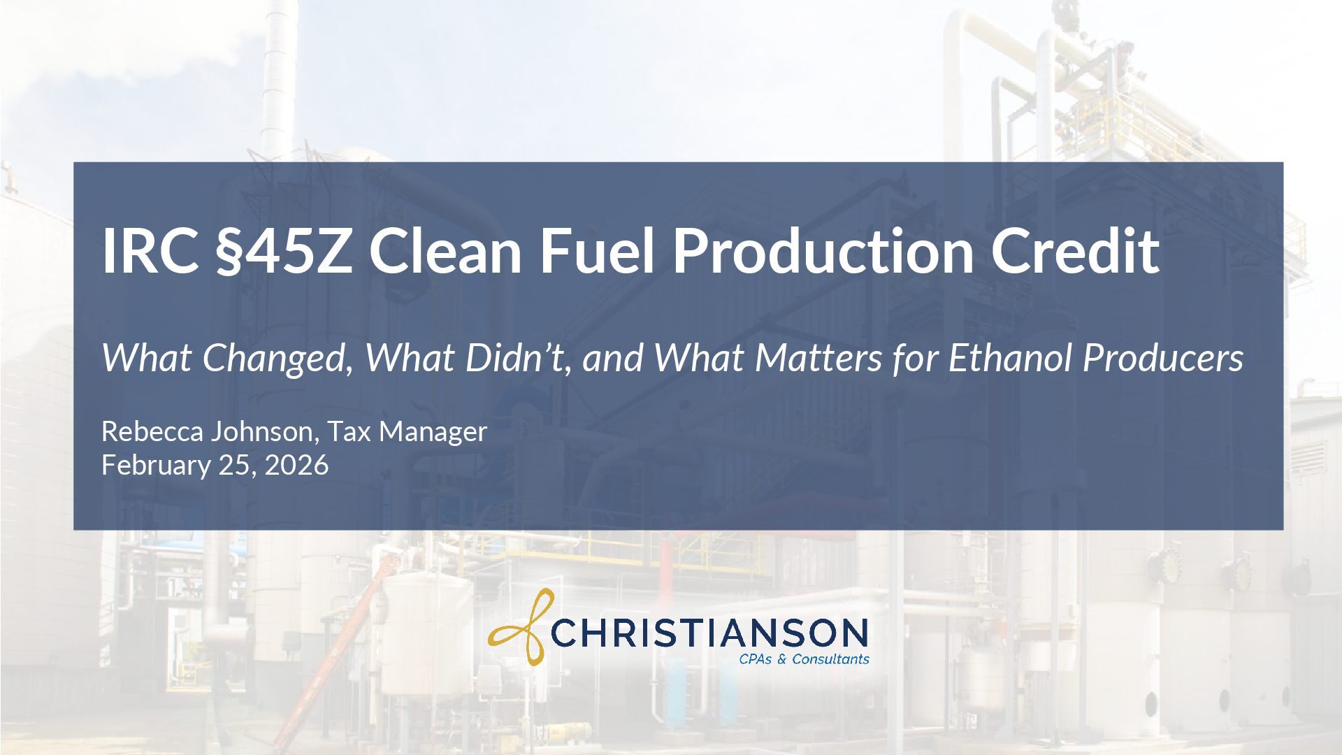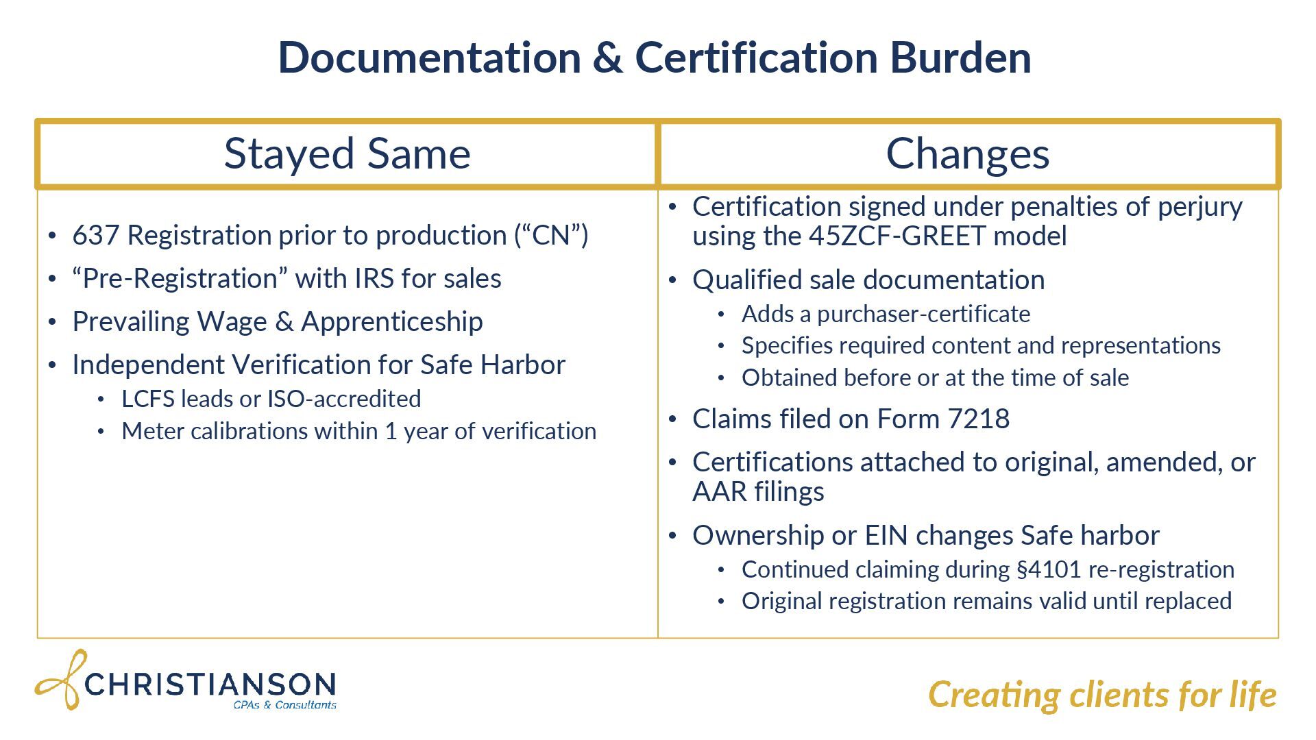 to production (“CN”) • “Pre-Registration” with IRS for sales • Prevailing Wage & Apprenticeship • Independent Verification for Safe Harbor • LCFS leads or ISO-accredited • Meter calibrations within 1 year of verification Changes • Certification signed under penalties of perjury using the 45ZCF-GREET model • Qualified sale documentation • Adds a purchaser-certificate • Specifies required content and representations • Obtained before or at the time of sale • Claims filed on Form 7218 • Certifications attached to original, amended, or AAR filings • Ownership or EIN changes Safe harbor • Continued claiming during §4101 re-registration • Original registration remains valid until replaced