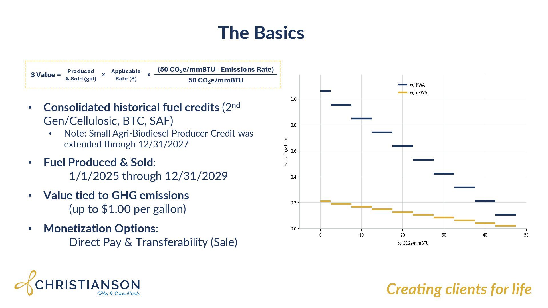 SAF) • Note: Small Agri-Biodiesel Producer Credit was extended through 12/31/2027 • Fuel Produced & Sold: 1/1/2025 through 12/31/2029 • Value tied to GHG emissions (up to $1.00 per gallon) • Monetization Options: Direct Pay & Transferability (Sale) (50 CO2 e/mmBTU - Emissions Rate) 50 CO2 e/mmBTU $ Value = Produced & Sold (gal) X X Applicable Rate ($)