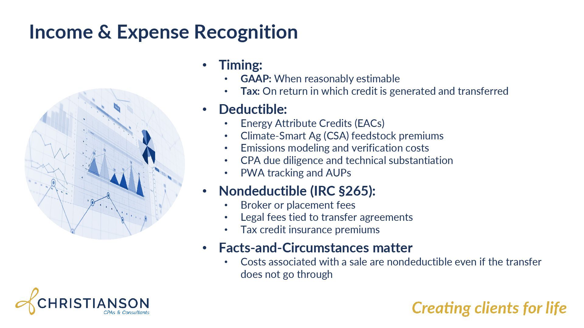 estimable • Tax: On return in which credit is generated and transferred • Deductible: • Energy Attribute Credits (EACs) • Climate-Smart Ag (CSA) feedstock premiums • Emissions modeling and verification costs • CPA due diligence and technical substantiation • PWA tracking and AUPs • Nondeductible (IRC §265): • Broker or placement fees • Legal fees tied to transfer agreements • Tax credit insurance premiums • Facts-and-Circumstances matter • Costs associated with a sale are nondeductible even if the transfer does not go through