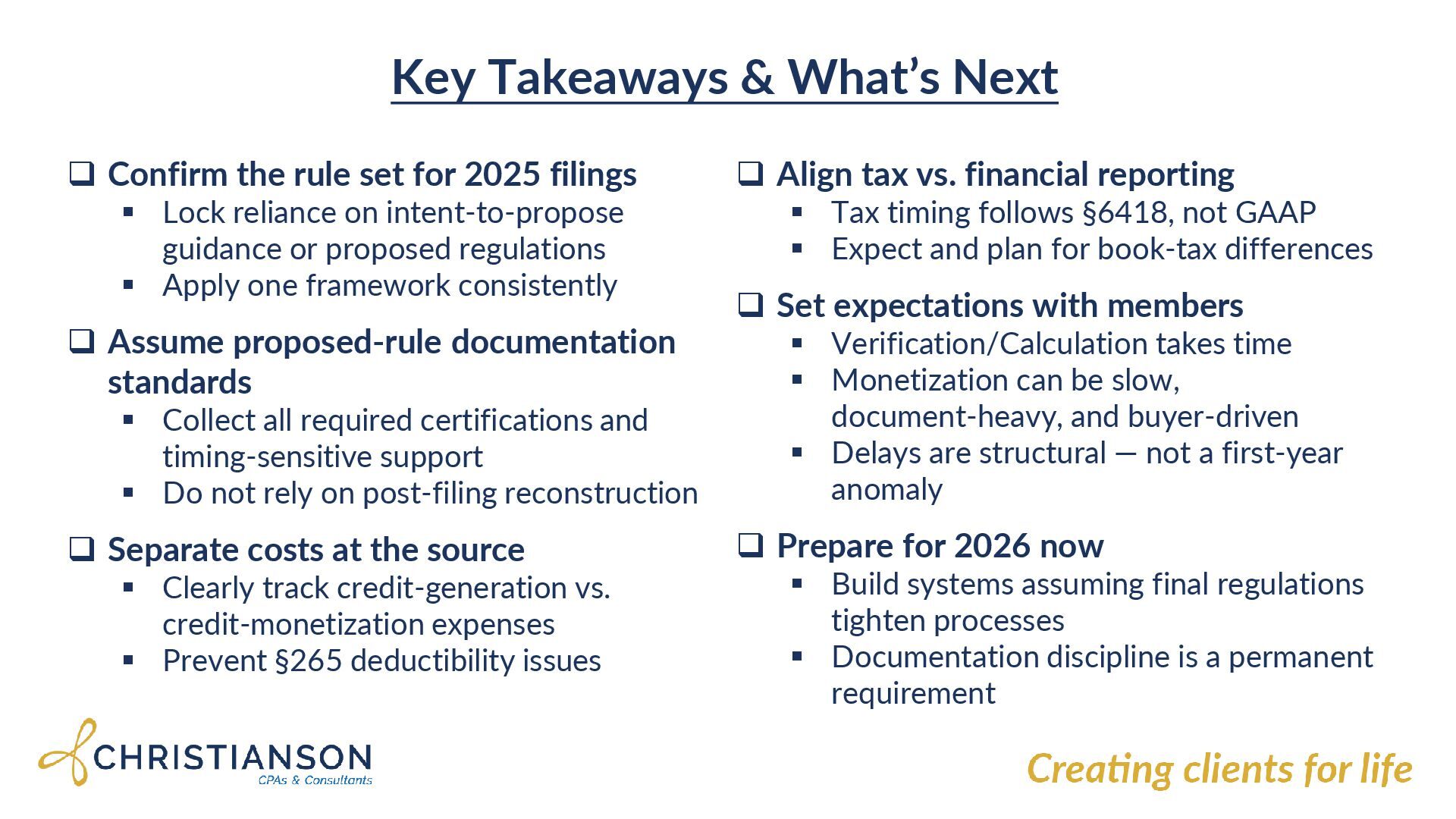 for 2025 filings Lock reliance on intent-to-propose guidance or proposed regulations Apply one framework consistently Assume proposed-rule documentation standards Collect all required certifications and timing-sensitive support Do not rely on post-filing reconstruction Separate costs at the source Clearly track credit-generation vs. credit-monetization expenses Prevent §265 deductibility issues Align tax vs. financial reporting Tax timing follows §6418, not GAAP Expect and plan for book-tax differences Set expectations with members Verification/Calculation takes time Monetization can be slow, document-heavy, and buyer-driven Delays are structural — not a first-year anomaly Prepare for 2026 now Build systems assuming final regulations tighten processes Documentation discipline is a permanent requirement