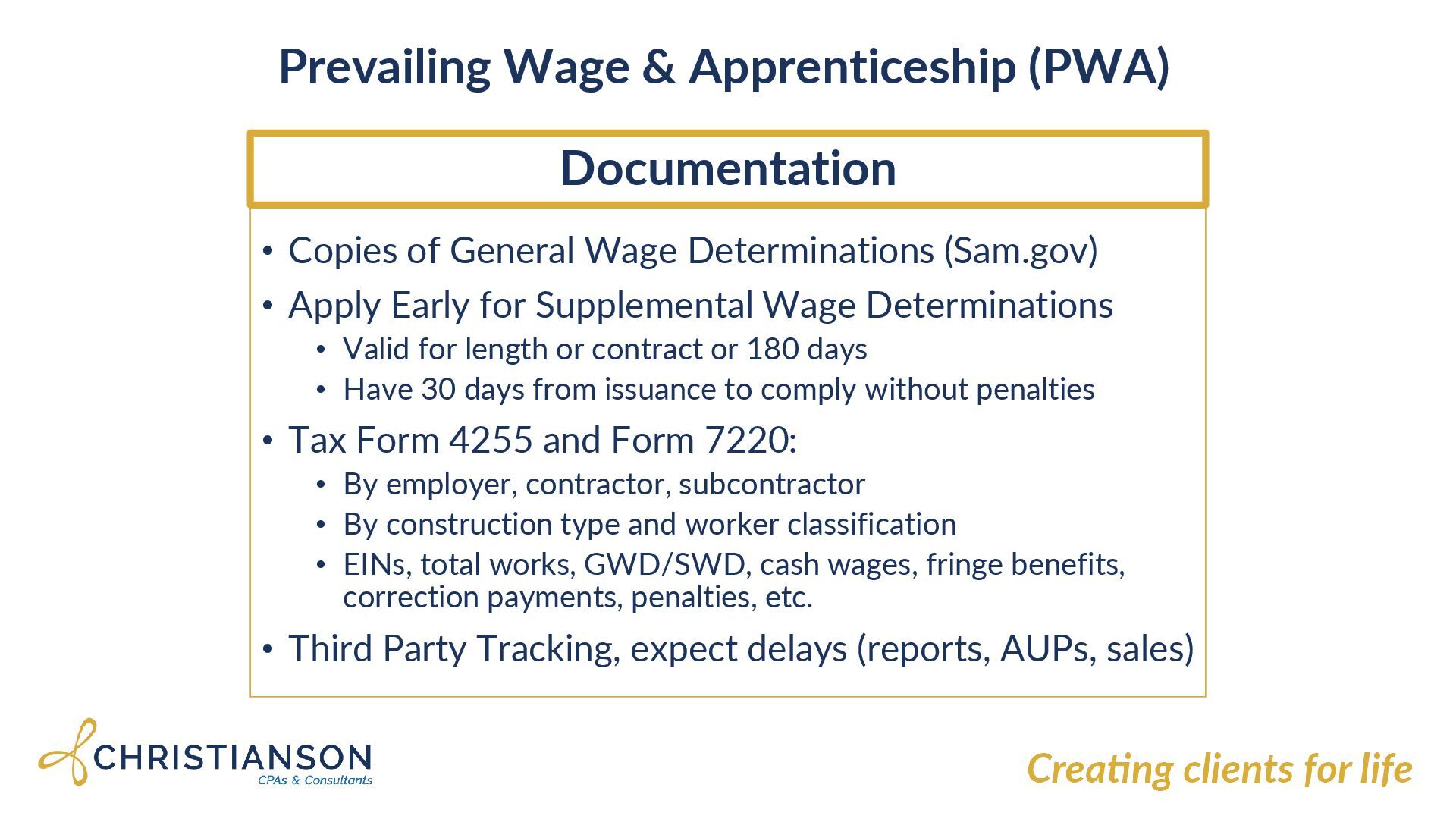 Wage Determinations (Sam.gov) • Apply Early for Supplemental Wage Determinations • Valid for length or contract or 180 days • Have 30 days from issuance to comply without penalties • Tax Form 4255 and Form 7220: • By employer, contractor, subcontractor • By construction type and worker classification • EINs, total works, GWD/SWD, cash wages, fringe benefits, correction payments, penalties, etc. • Third Party Tracking, expect delays (reports, AUPs, sales)