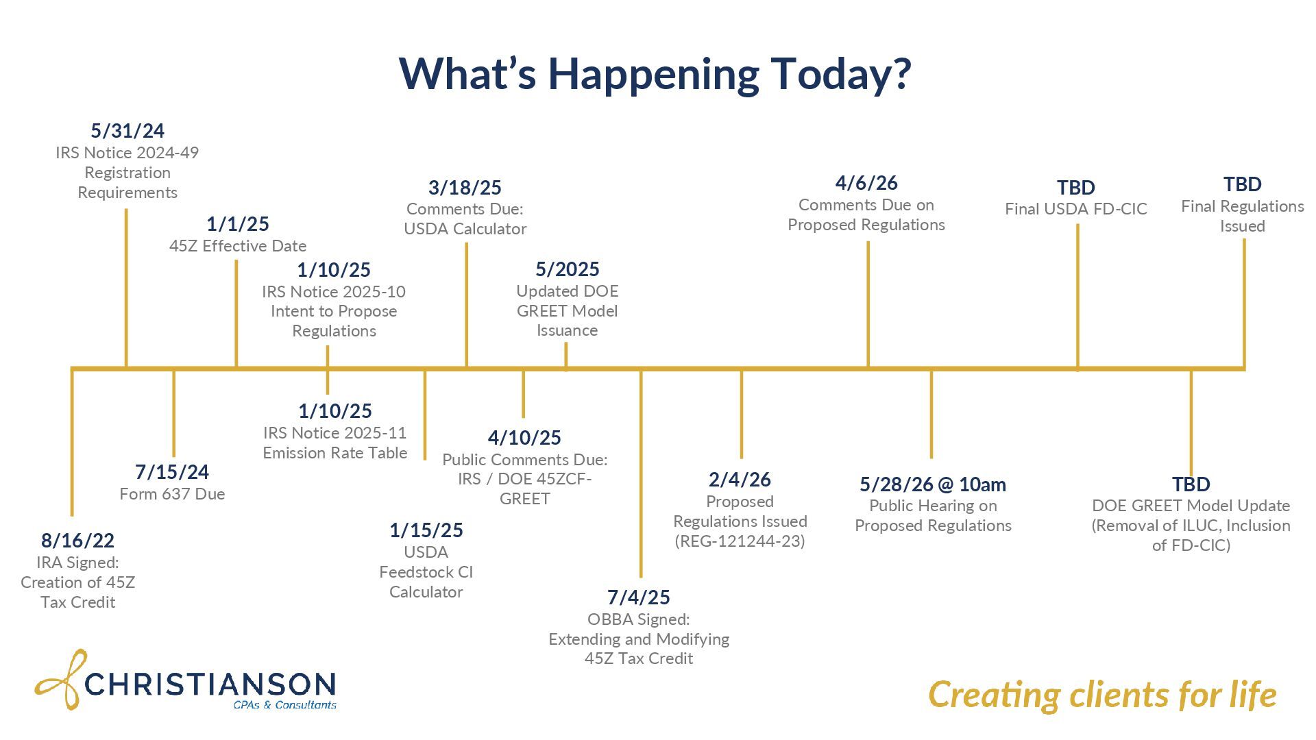 Form 637 Due 1/1/25 45Z Effective Date 1/10/25 IRS Notice 2025-11 Emission Rate Table 1/10/25 IRS Notice 2025-10 Intent to Propose Regulations 1/15/25 USDA Feedstock CI Calculator 3/18/25 Comments Due: USDA Calculator 4/10/25 Public Comments Due: IRS / DOE 45ZCF- GREET 5/2025 Updated DOE GREET Model Issuance 2/4/26 Proposed Regulations Issued (REG-121244-23) 4/6/26 Comments Due on Proposed Regulations 5/28/26 @ 10am Public Hearing on Proposed Regulations TBD Final USDA FD-CIC TBD DOE GREET Model Update (Removal of ILUC, Inclusion of FD-CIC) TBD Final Regulations Issued 8/16/22 IRA Signed: Creation of 45Z Tax Credit 7/4/25 OBBA Signed: Extending and Modifying 45Z Tax Credit