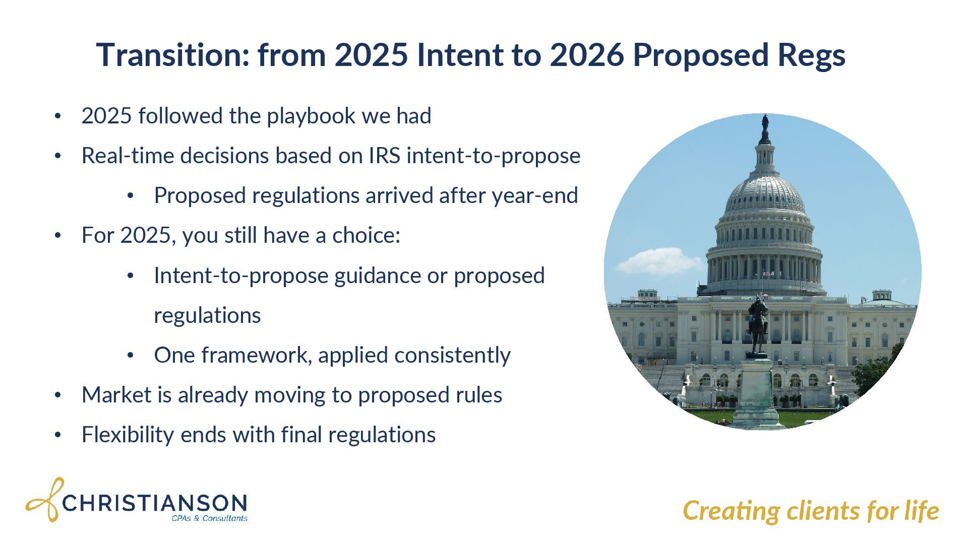 followed the playbook we had • Real-time decisions based on IRS intent-to-propose • Proposed regulations arrived after year-end • For 2025, you still have a choice: • Intent-to-propose guidance or proposed regulations • One framework, applied consistently • Market is already moving to proposed rules • Flexibility ends with final regulations