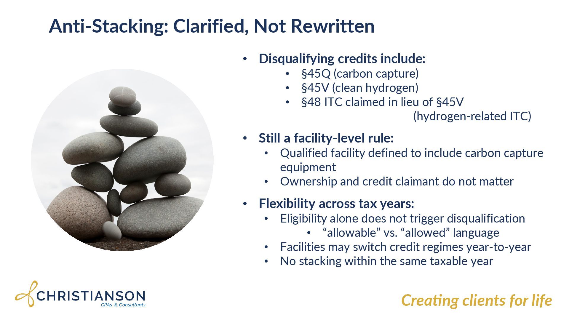 (carbon capture) • §45V (clean hydrogen) • §48 ITC claimed in lieu of §45V (hydrogen-related ITC) • Still a facility-level rule: • Qualified facility defined to include carbon capture equipment • Ownership and credit claimant do not matter • Flexibility across tax years: • Eligibility alone does not trigger disqualification • “allowable” vs. “allowed” language • Facilities may switch credit regimes year-to-year • No stacking within the same taxable year