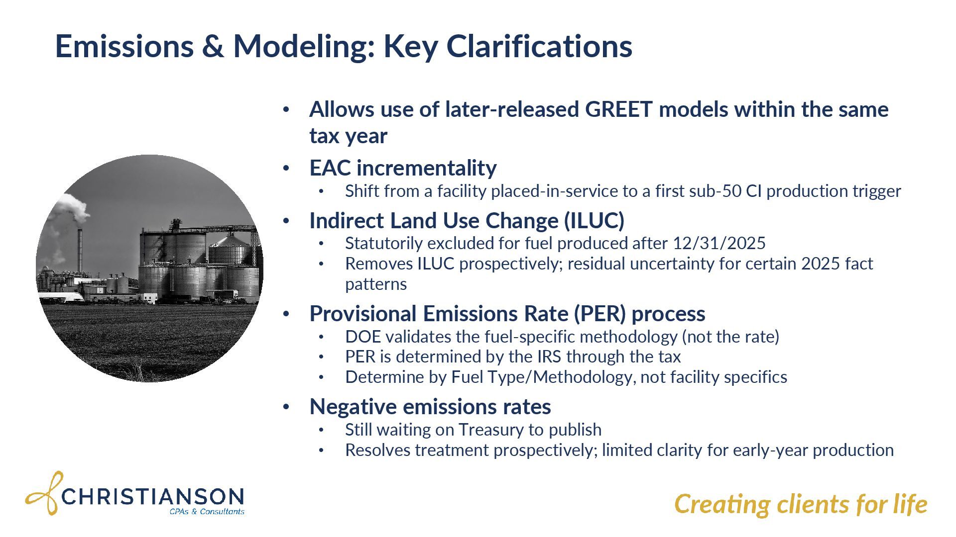 GREET models within the same tax year • EAC incrementality • Shift from a facility placed-in-service to a first sub-50 CI production trigger • Indirect Land Use Change (ILUC) • Statutorily excluded for fuel produced after 12/31/2025 • Removes ILUC prospectively; residual uncertainty for certain 2025 fact patterns • Provisional Emissions Rate (PER) process • DOE validates the fuel-specific methodology (not the rate) • PER is determined by the IRS through the tax • Determine by Fuel Type/Methodology, not facility specifics • Negative emissions rates • Still waiting on Treasury to publish • Resolves treatment prospectively; limited clarity for early-year production