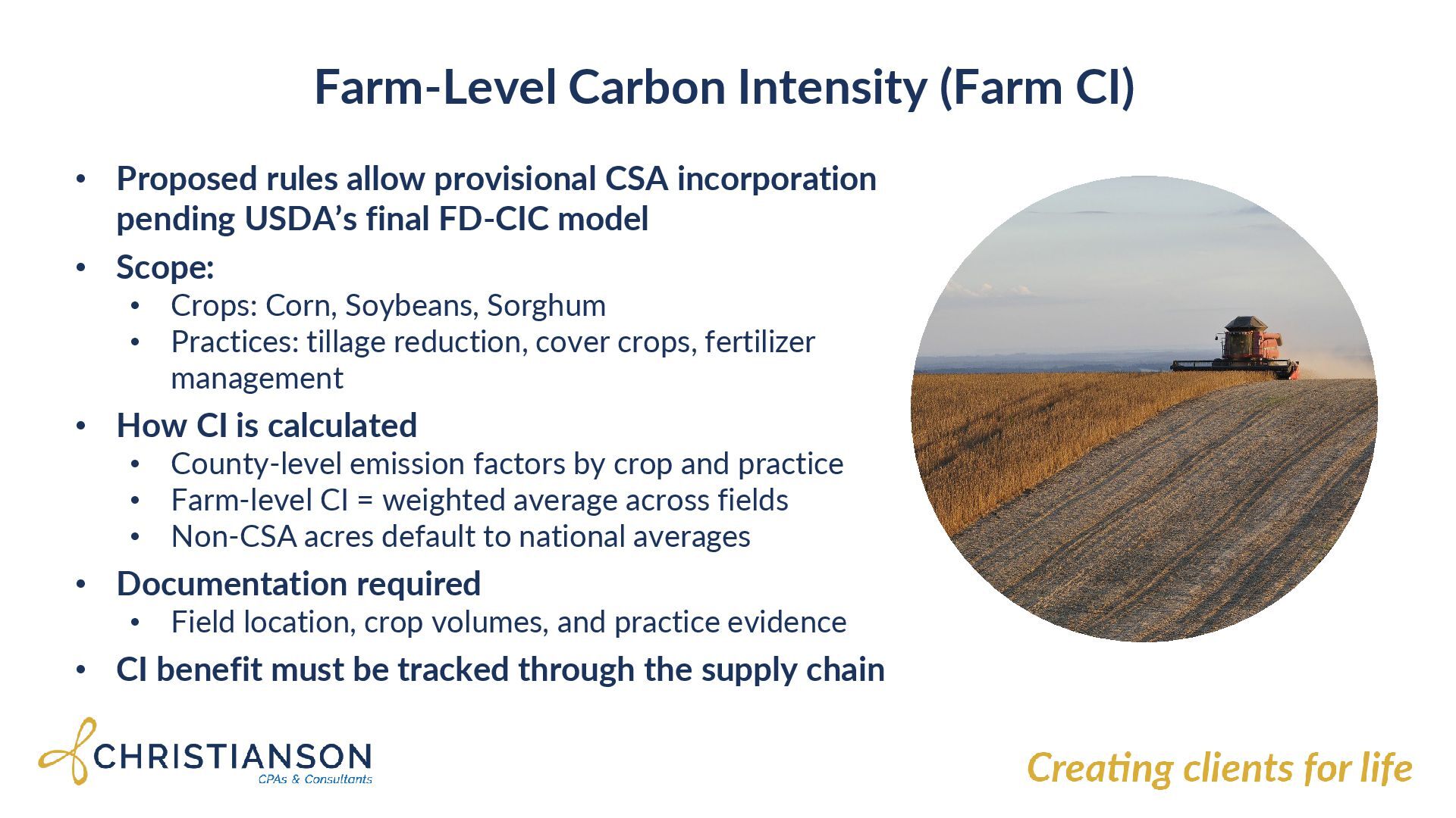 CSA incorporation pending USDA’s final FD-CIC model • Scope: • Crops: Corn, Soybeans, Sorghum • Practices: tillage reduction, cover crops, fertilizer management • How CI is calculated • County-level emission factors by crop and practice • Farm-level CI = weighted average across fields • Non-CSA acres default to national averages • Documentation required • Field location, crop volumes, and practice evidence • CI benefit must be tracked through the supply chain
