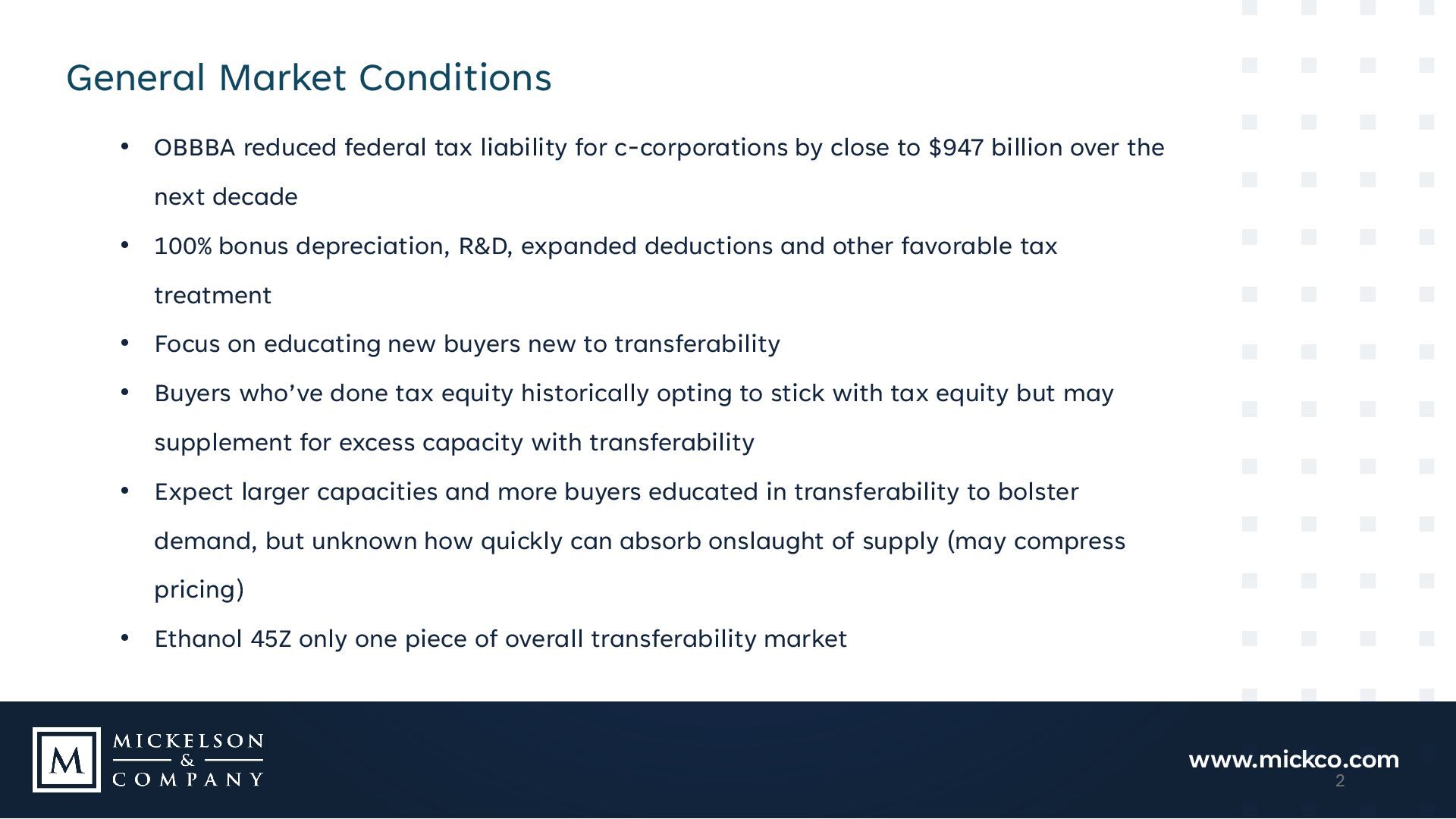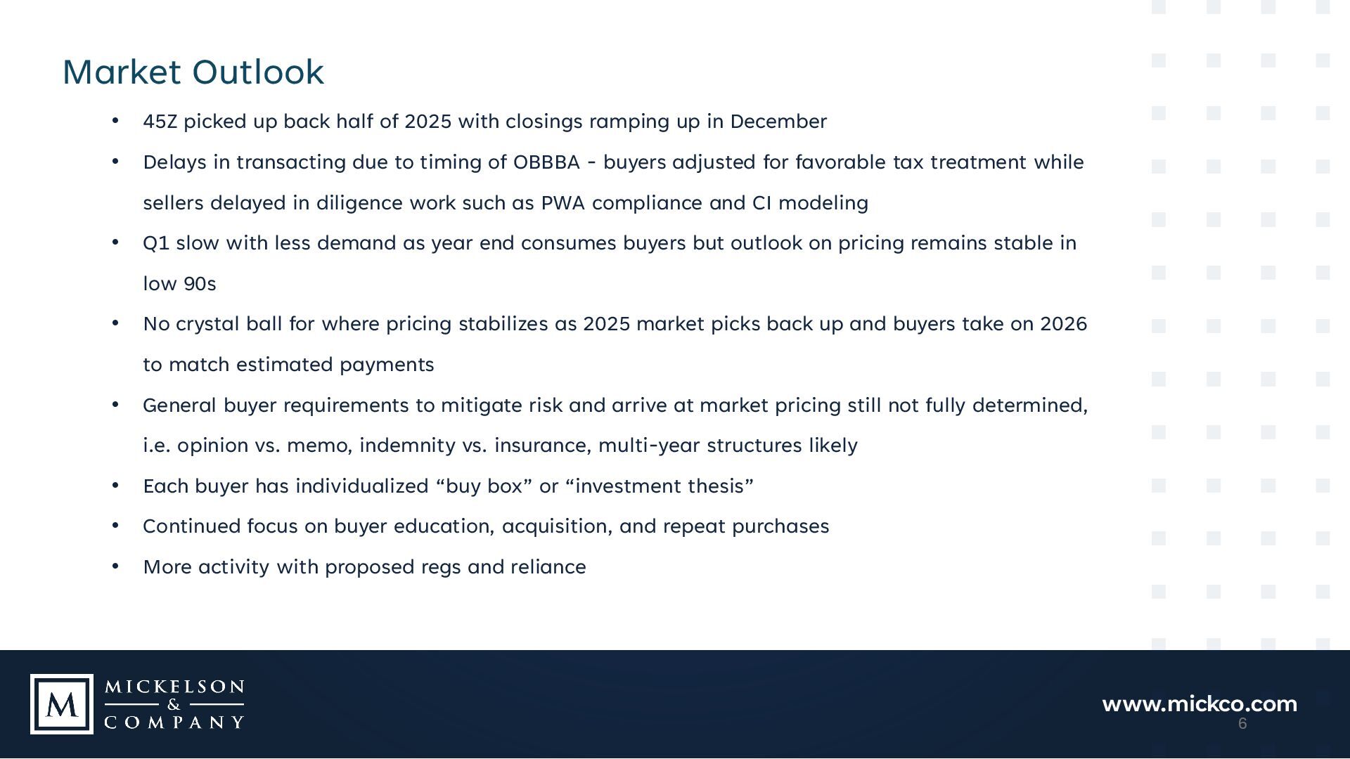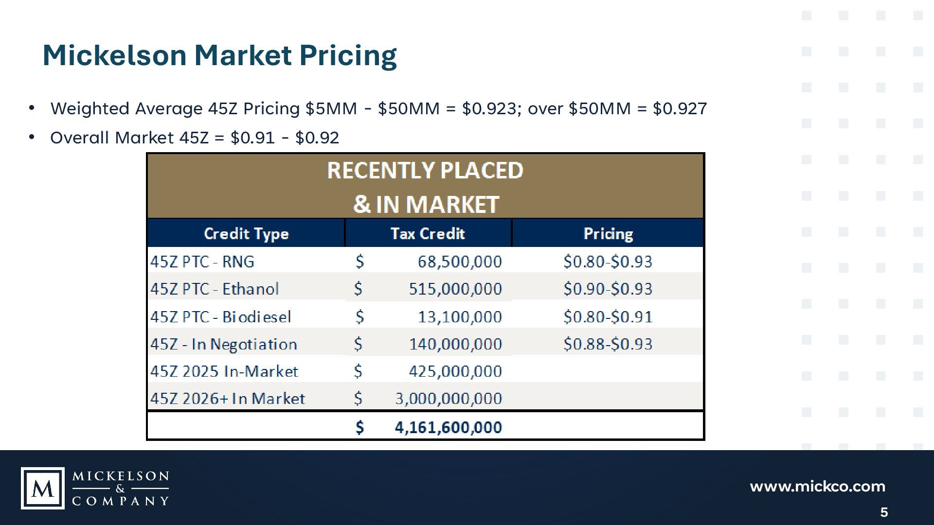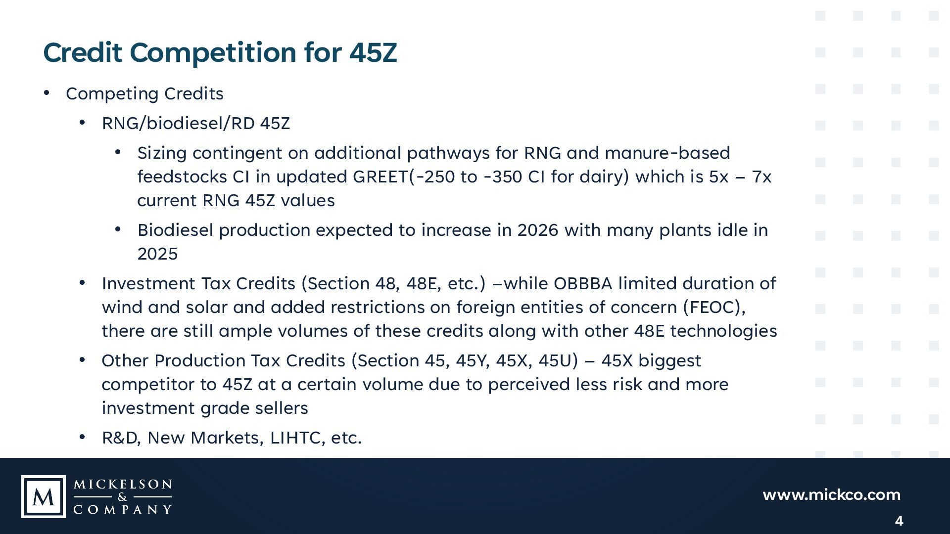 • Sizing contingent on additional pathways for RNG and manure-based feedstocks CI in updated GREET(-250 to -350 CI for dairy) which is 5x – 7x current RNG 45Z values • Biodiesel production expected to increase in 2026 with many plants idle in 2025 • Investment Tax Credits (Section 48, 48E, etc.) –while OBBBA limited duration of wind and solar and added restrictions on foreign entities of concern (FEOC), there are still ample volumes of these credits along with other 48E technologies • Other Production Tax Credits (Section 45, 45Y, 45X, 45U) – 45X biggest competitor to 45Z at a certain volume due to perceived less risk and more investment grade sellers • R&D, New Markets, LIHTC, etc. www.mickco.com 4