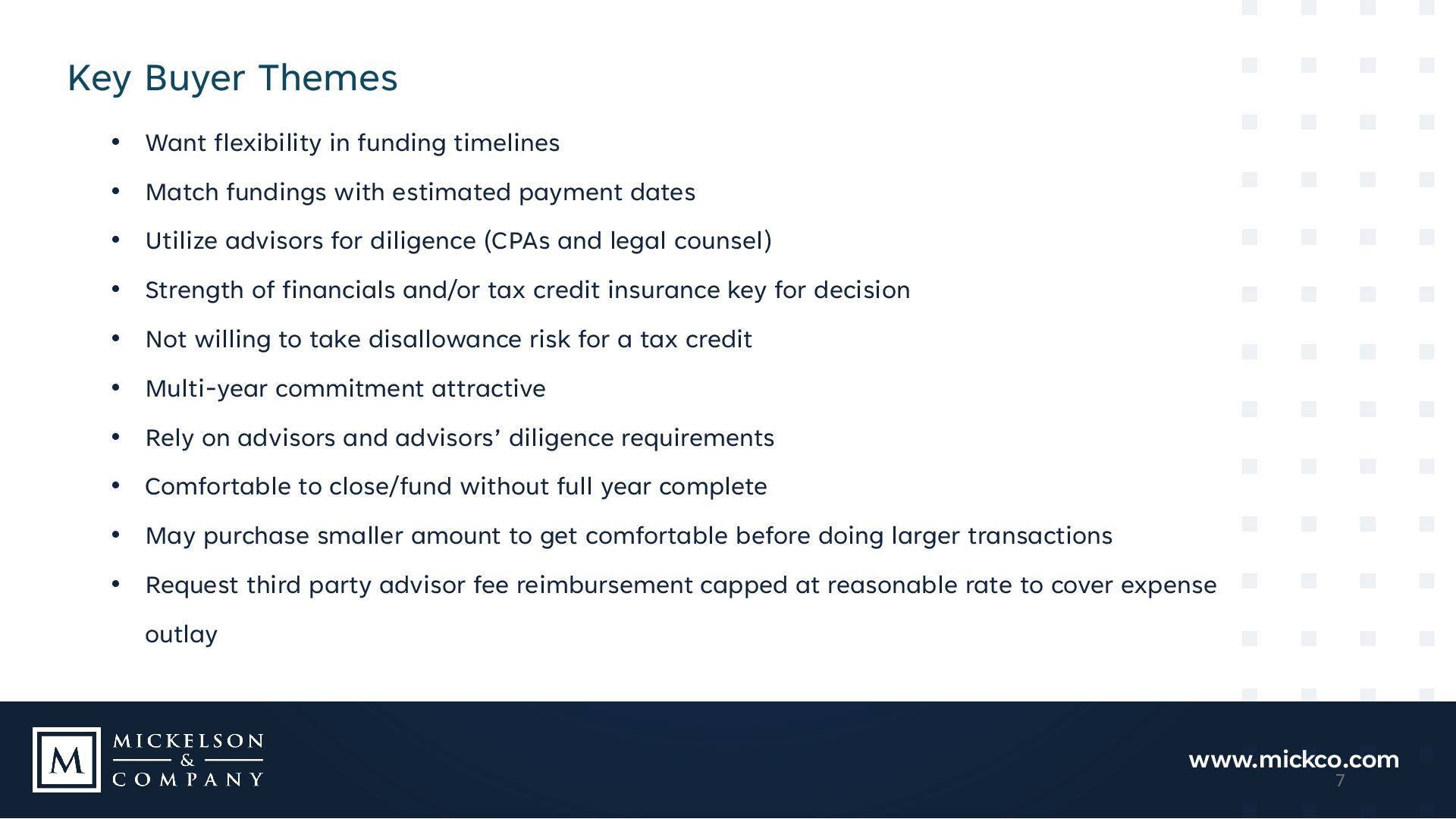 2025 with closings ramping up in December • Delays in transacting due to timing of OBBBA - buyers adjusted for favorable tax treatment while sellers delayed in diligence work such as PWA compliance and CI modeling • Q1 slow with less demand as year end consumes buyers but outlook on pricing remains stable in low 90s • No crystal ball for where pricing stabilizes as 2025 market picks back up and buyers take on 2026 to match estimated payments • General buyer requirements to mitigate risk and arrive at market pricing still not fully determined, i.e. opinion vs. memo, indemnity vs. insurance, multi-year structures likely • Each buyer has individualized “buy box” or “investment thesis” • Continued focus on buyer education, acquisition, and repeat purchases • More activity with proposed regs and reliance 6