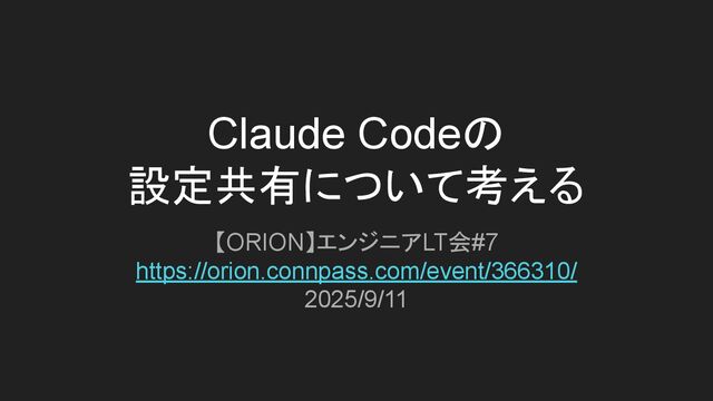 Claude Codeの 設定共有について考える 【ORION】エンジニアLT会#7 https://orion.connpass.com/event/366310/ 2025/9/11