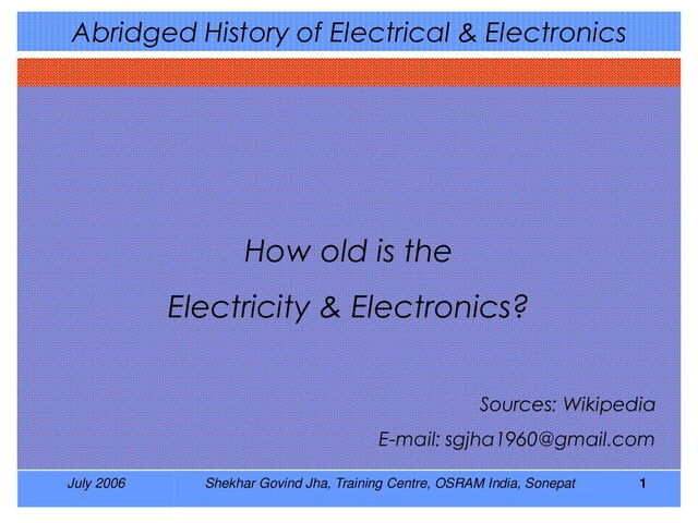 Jha, Training Centre, OSRAM India, Sonepat 52 Thomas Edison's greatest challenge was the development of a practical incandescent, electric light. Contrary to popular belief, he didn't "invent" the light-bulb, but rather he improved upon a 50-year-old idea. In 1879, using lower current electricity, a small carbonized filament, and an improved vacuum inside the globe, he was able to produce a reliable, long-lasting source of light. 15. Thomas Alva Edison (1847-1931)