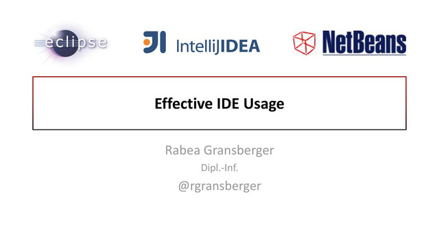 code • Common: Rename, Move, change signature – Extract variable, method, constant – Create superclass, interface, pull up, push down • Safe delete is not present in (E) but can be simulated: – Empty the body of the method to delete – Inline the method, which results in replacing it with nothing • NetBeans provides additional transformation to Java 7 and Java 8 – Refactor Inspect and Transform 34 12.05.2015 vJUG / Effective IDE Usage (Rabea Gransberger @rgransberger)